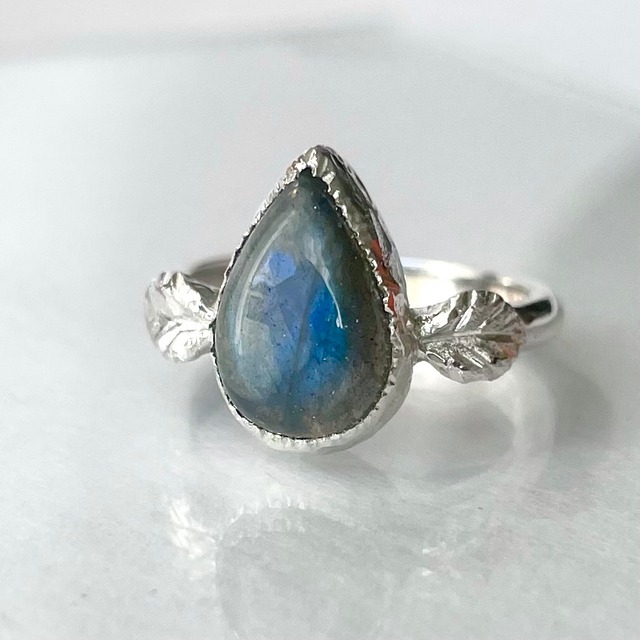 アフリカ産天然ラブラドライトを使ったシルバーの指輪です。 神秘的な輝きを持つラブラドライトと、生命力溢れる植物モチーフが調和した美しいデザインです。 淡いグレーと水色が混ざり合うこのラブラドライトは光の角度で表情を変える幻想的で美しい石です。 石の表面にはキズなどもありますが、ナチュラルな美しさを損なわない様、手作りの無骨さと植物で仕上げました。 自然のエネルギーを感じさせるこの指輪は、日常使いから特別な日まで幅広く活躍してくれると思います。 個性的でありながら、柔らかな印象を与えてくれます。 ☆こちらのリングは一点物になります。 【天然石につきまして】 天然石の性質上、色ムラ、インクルージョン (内包物)クラックなどがある場合がございます。 自然の産物ならではの素材の魅力とご理解 下さいますようよろしくお願いいたします。 ~~~~~~~~~~~~~~~~~~~~~~~~~~~~~~ 【サイズ】 縦13.8mm 【使用金属】SILVER925 【使用石】アフリカ産天然ラブラドライト (11.5×9×4.8mm)4.32ct 【サイズ】12.5号(12.5号〜13号までサイズのお直しは出来ます) ※サイズのお直しの場合は3日程お時間を頂きます。