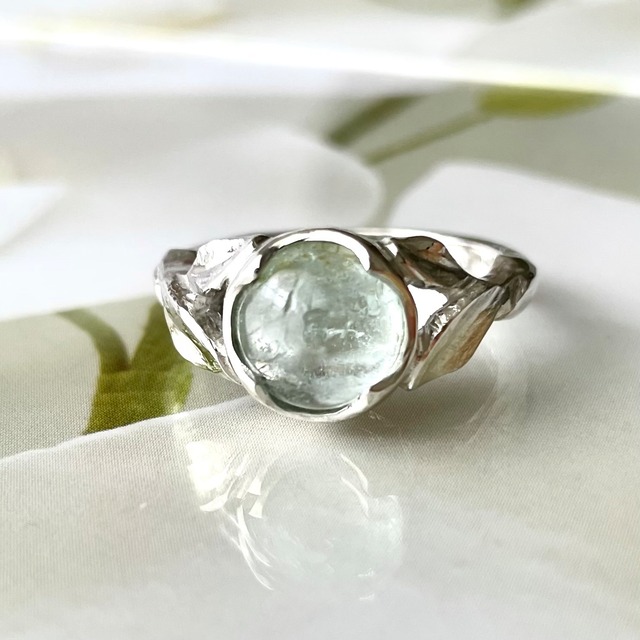 アクアマリンを使ったボタニカルリングです。 透明感のあるブルーグリーンが特徴のアクアマリンは、とても清らかな色合いで、まるで自然の美しさを手元に宿したかのようです。 リングのデザインはボタニカルで、大きい2枚の葉にはうっすらとK10を溶かし込んでアクアマリンの冷たい色合いと素敵に調和できる雰囲気に仕上げました。 オーガニックな雰囲気を持った個性が光るお洒落なリングです。 ☆こちらのリングは一点物になります。 【天然石につきまして】 天然石の性質上、色ムラ、インクルージョン(内包物)などがございます。 自然の産物ならではの素材の魅力とご理解くだ いますようよろしくお願いいたします。 ~~~~~~~~~~~~~~~~~~~~~~~~~~~~~~ 【サイズ】 上下幅10.3mm 【使用金属】SILVER925、K10 【使用石】ブラジル産天然アクアマリン(8.6×5.1mm) 2.465ct 【リングサイズ】15号(15号〜15.5号までサイズのお直しが出来ます) ※サイズのお直しの場合は、3日程お時間を頂きます。