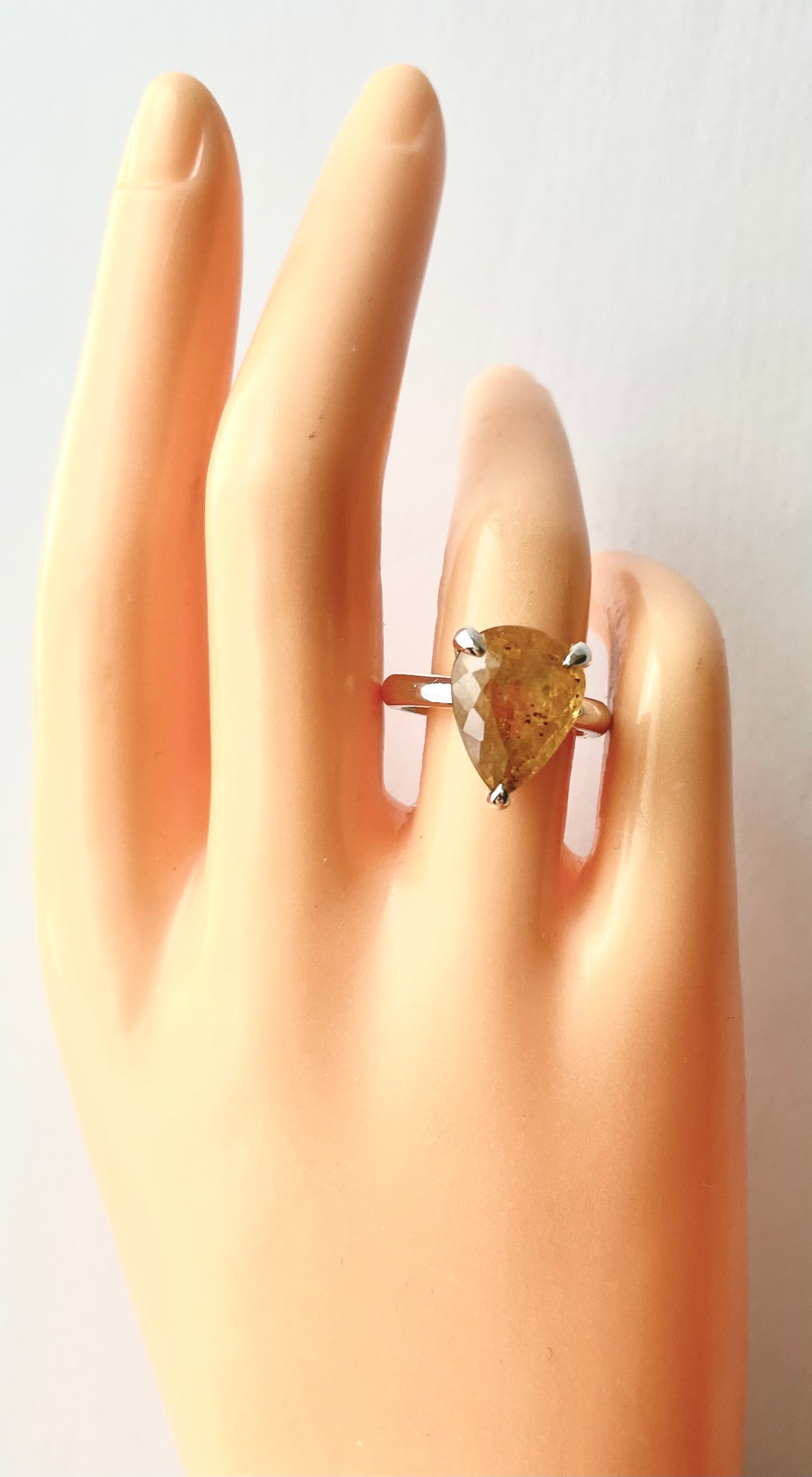 特にその色味は、まるで太陽の光を浴びたような暖かさを感じさせ、手元を一層華やかに装飾します。リングのデザインはインペリアルトパーズを際立たせるために、シルプルにまとめてみました。