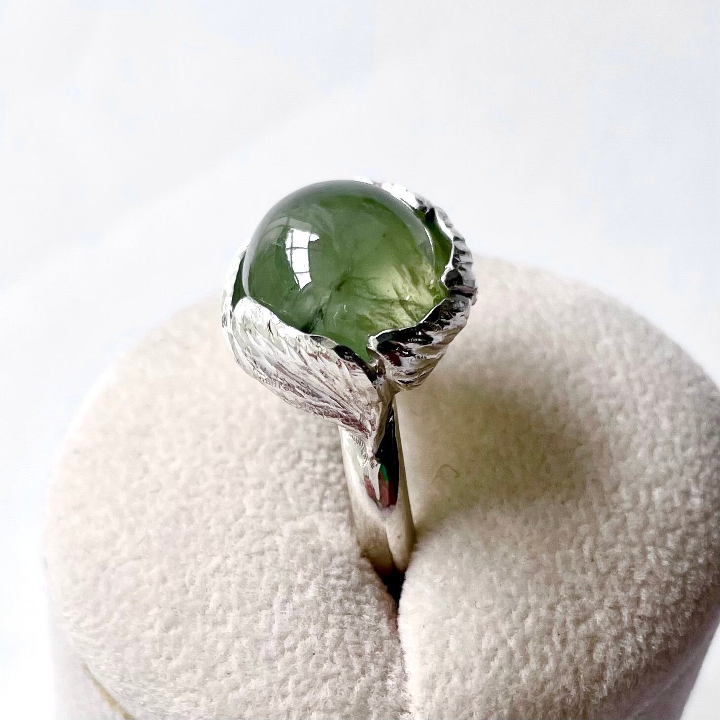 優しいマスカットグリーン色が特徴のこのプレナイトは、まるで自然の中に存在する植物のような透明感を持ち、指先に繊細な美しさを添えてくれます。