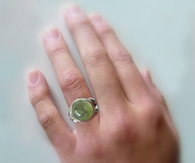 天然非加熱マリ産のルチル入りプレナイトを使った指輪です。
