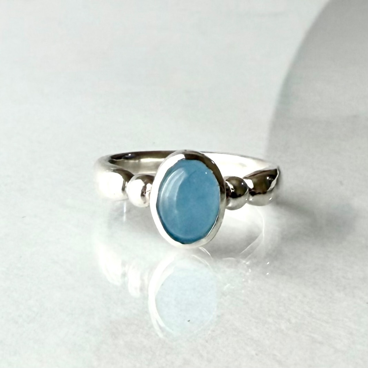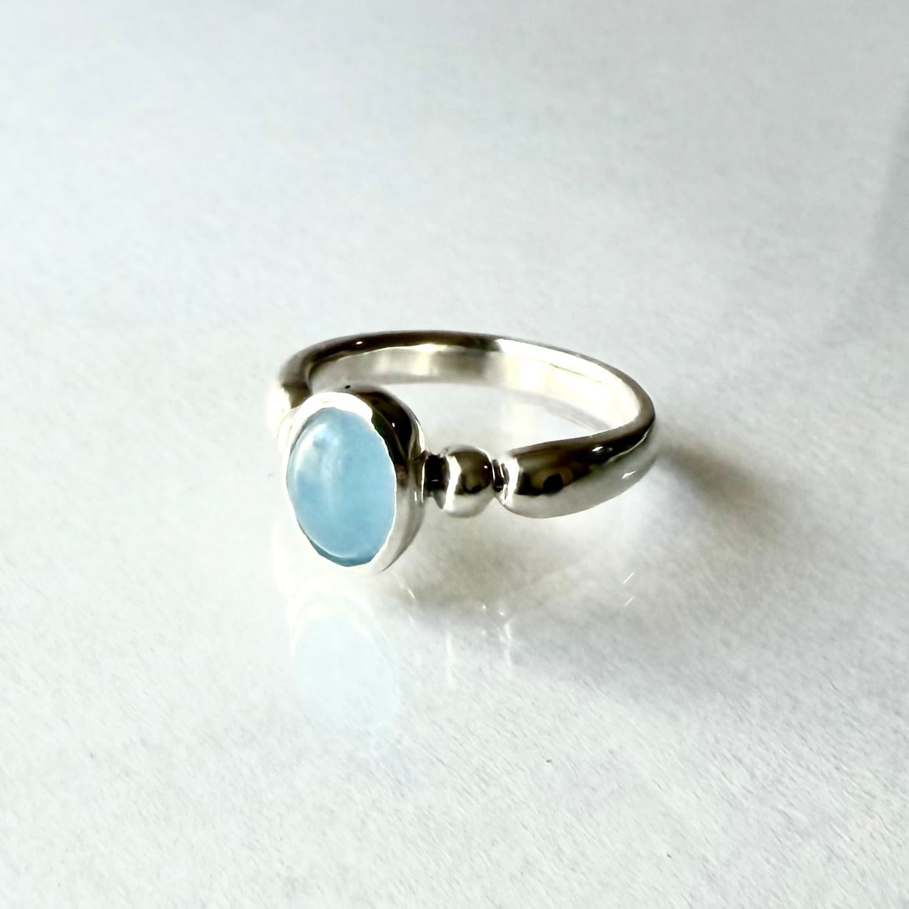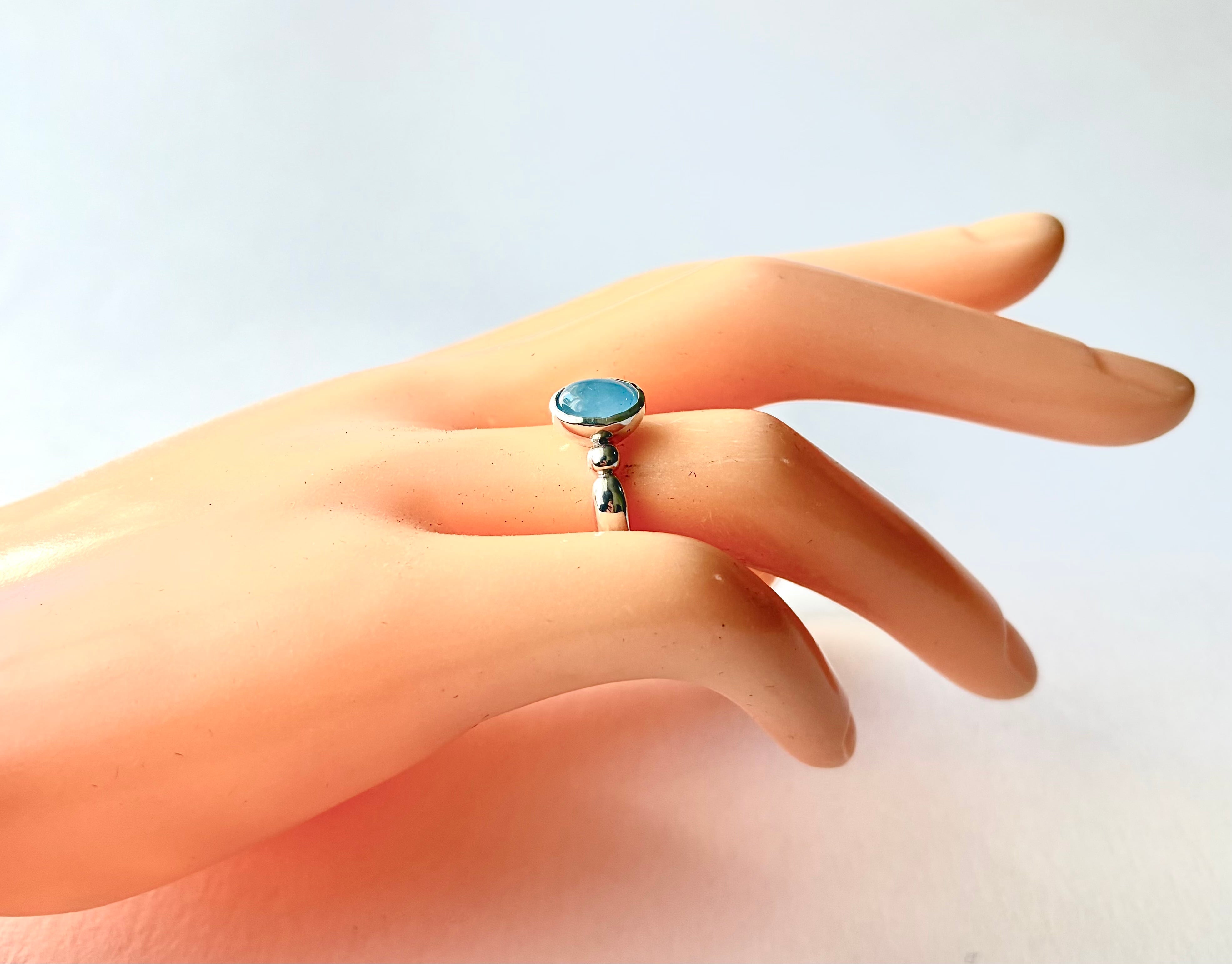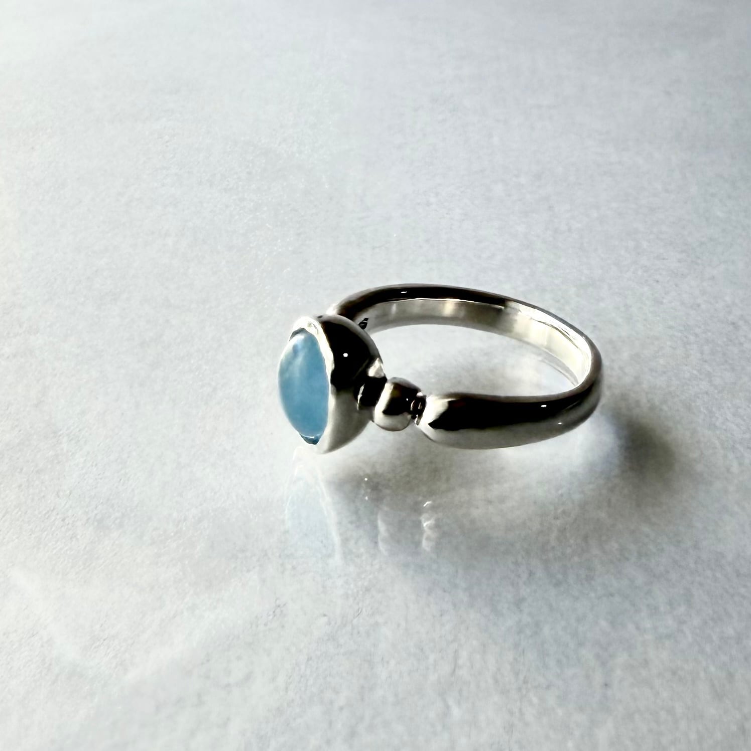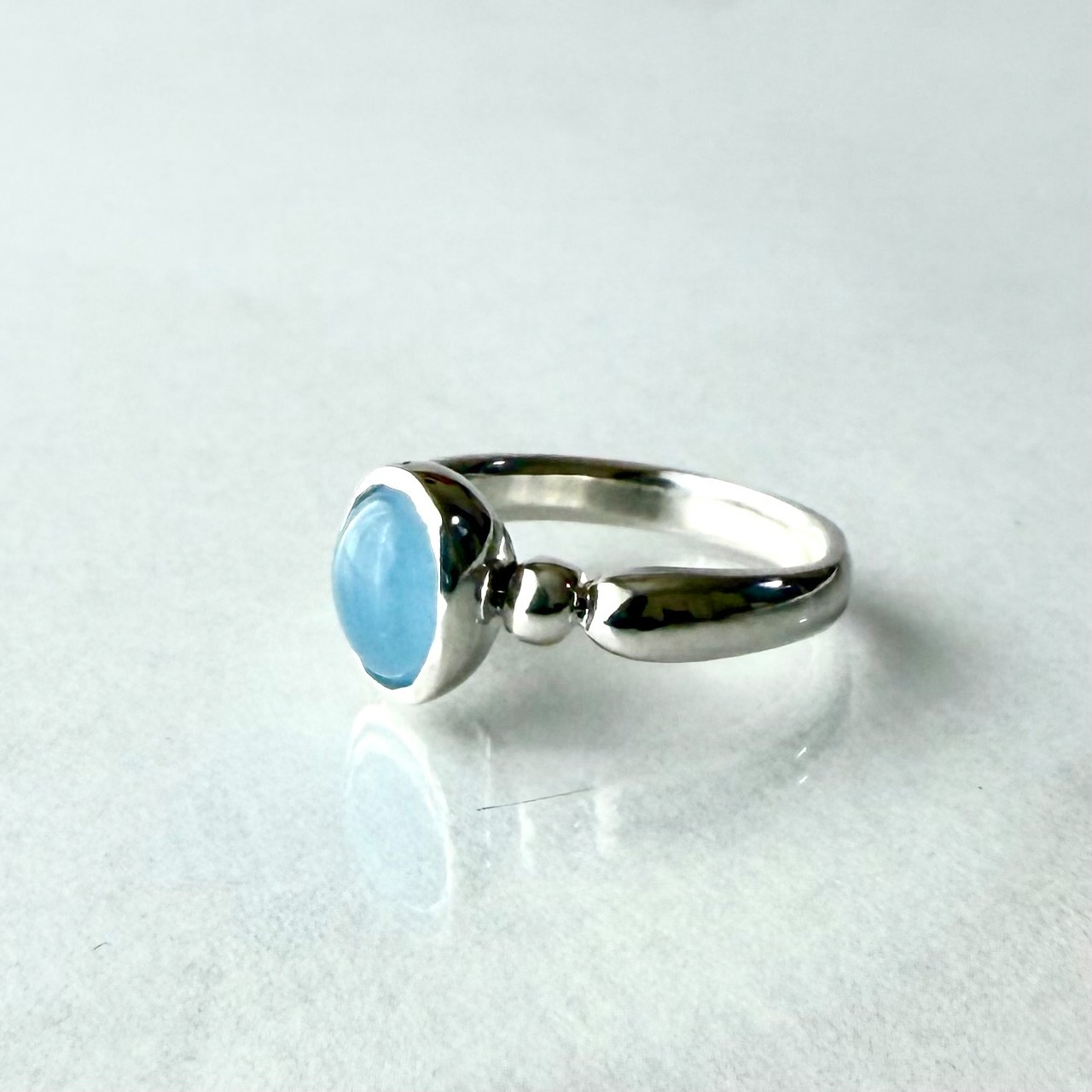 柔らかな水色が心を癒し、どんなスタイルにもマッチするシンプルでありながら存在感が際立つ指輪です。