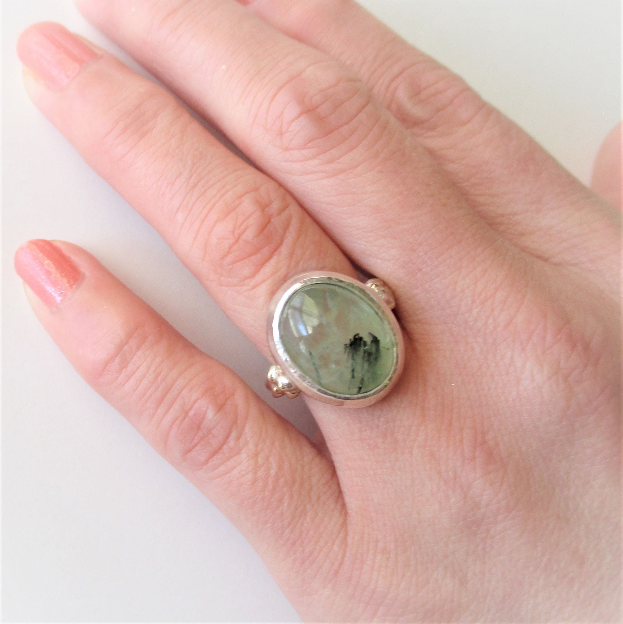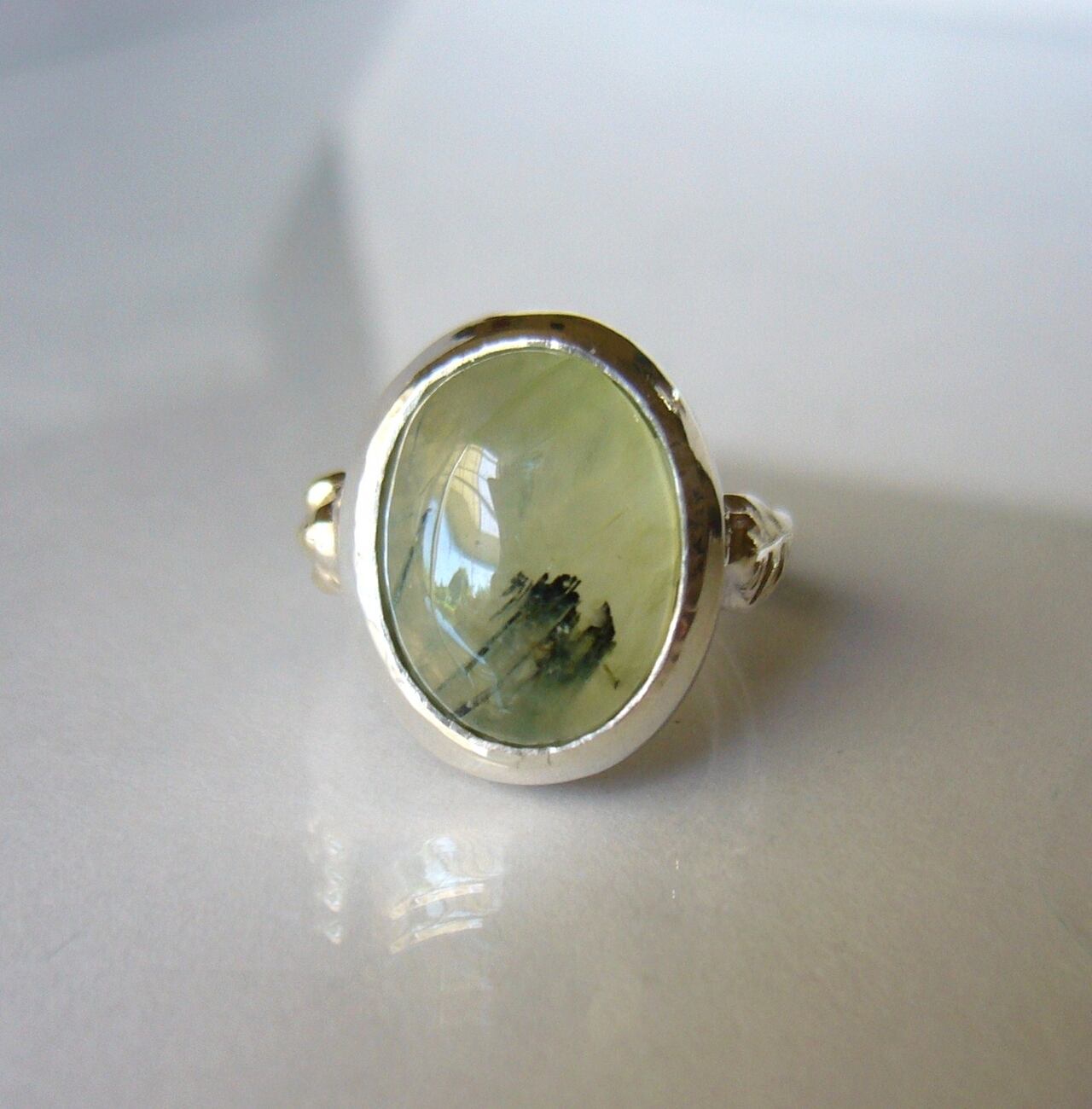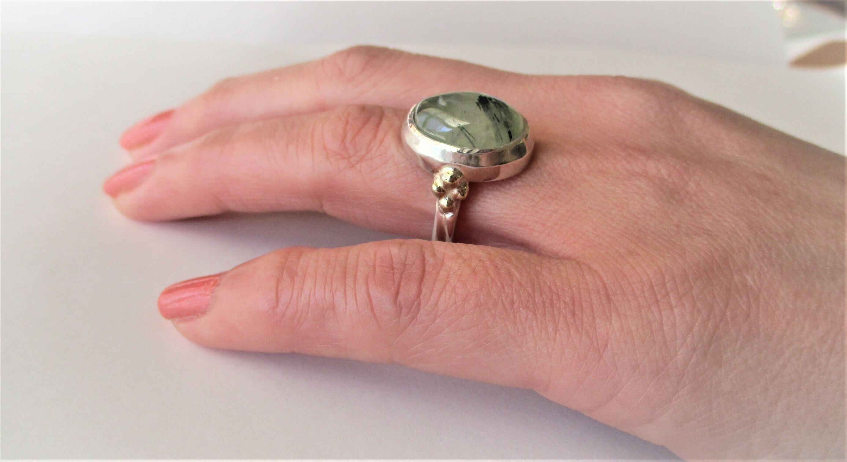 天然非加熱マリ産のブラックルチル入りプレナイトを使った指輪です。