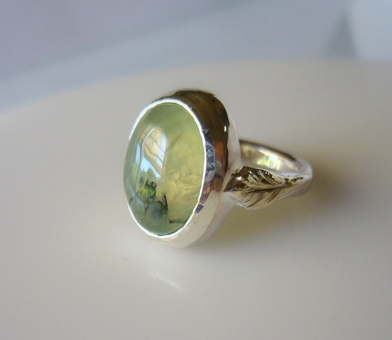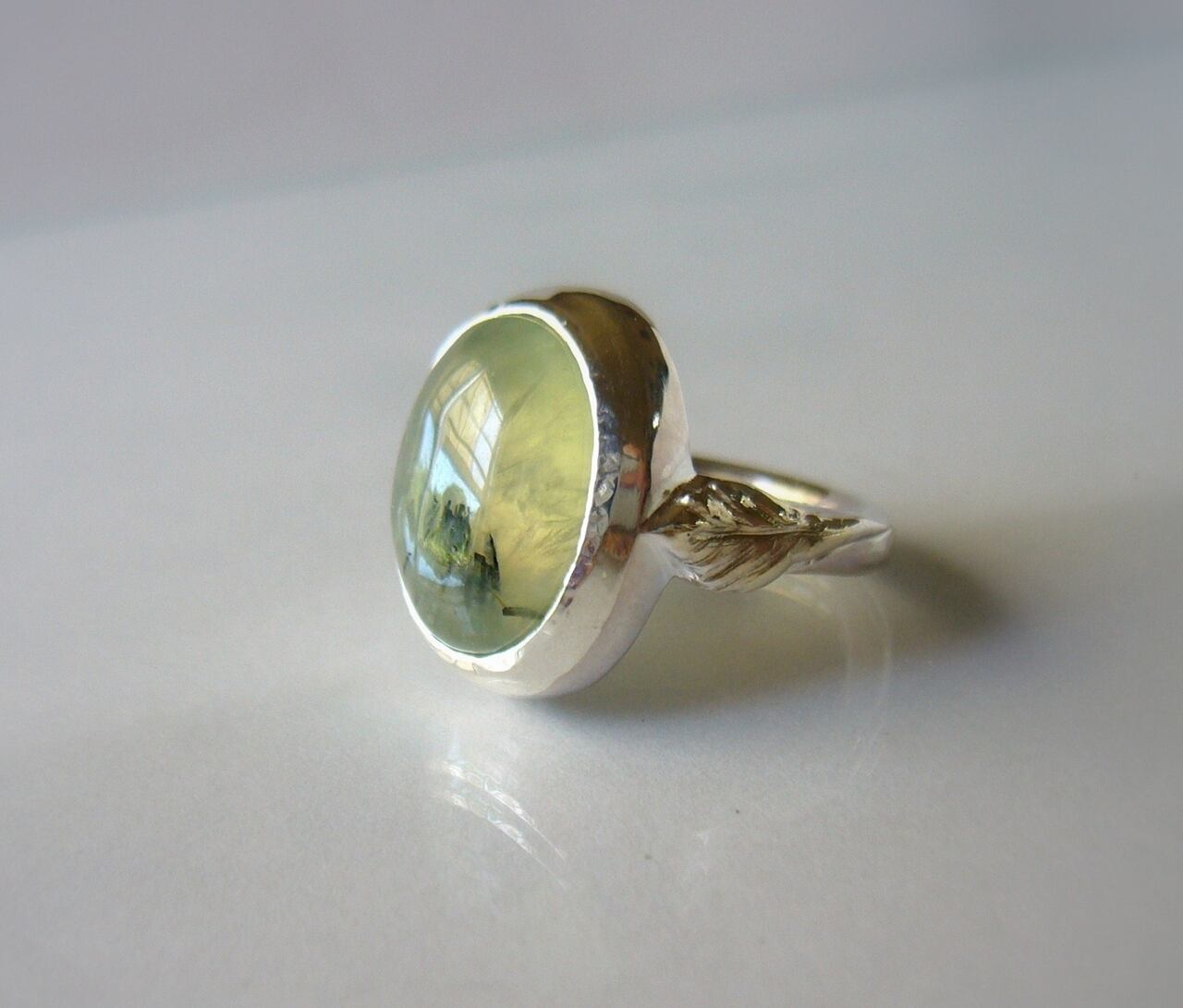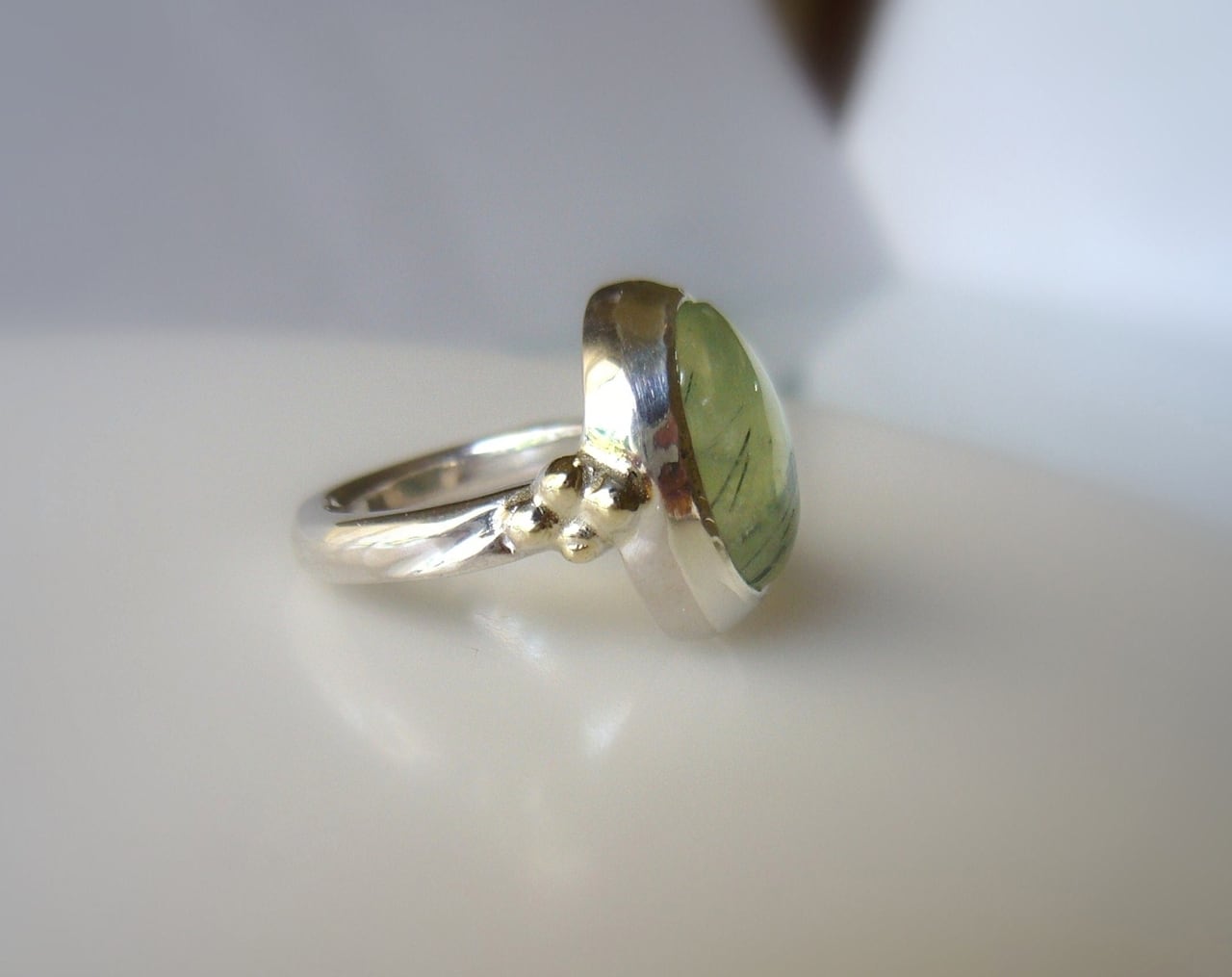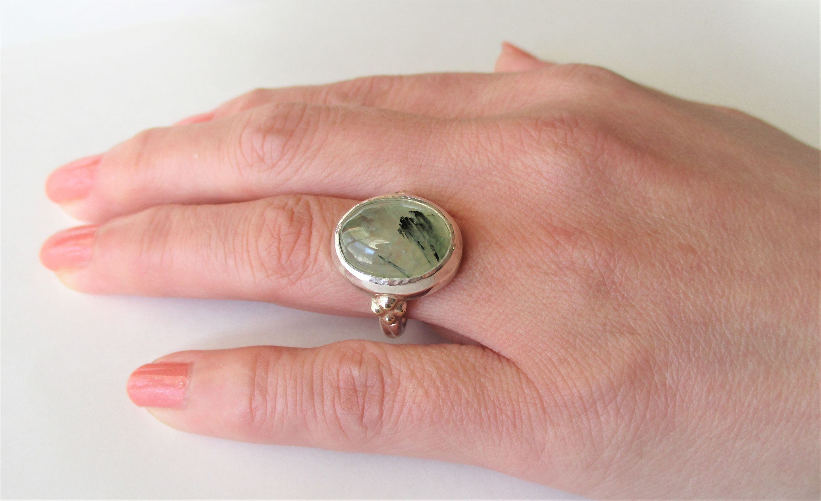 天然非加熱マリ産のブラックルチル入りプレナイトを使った指輪です。