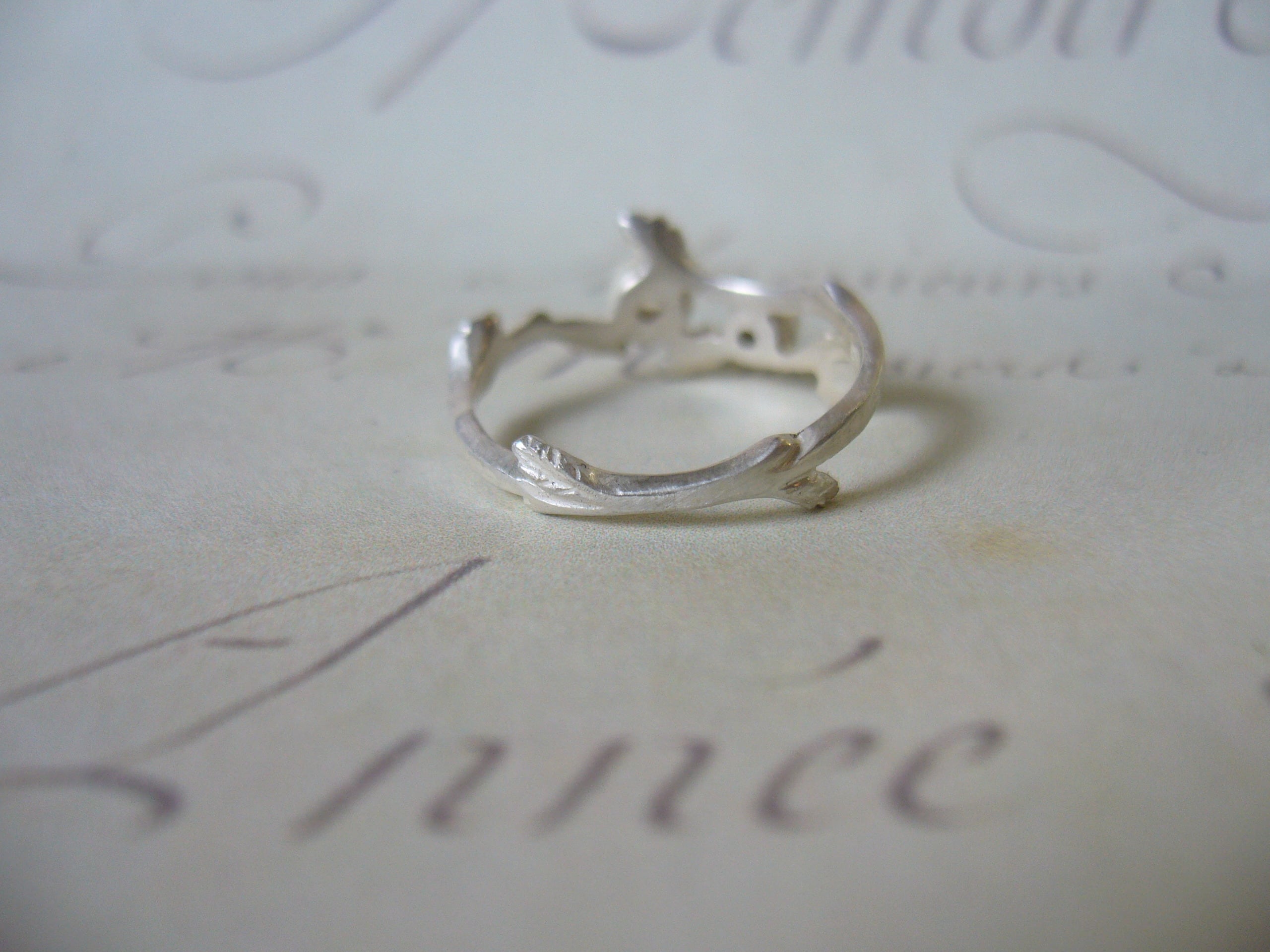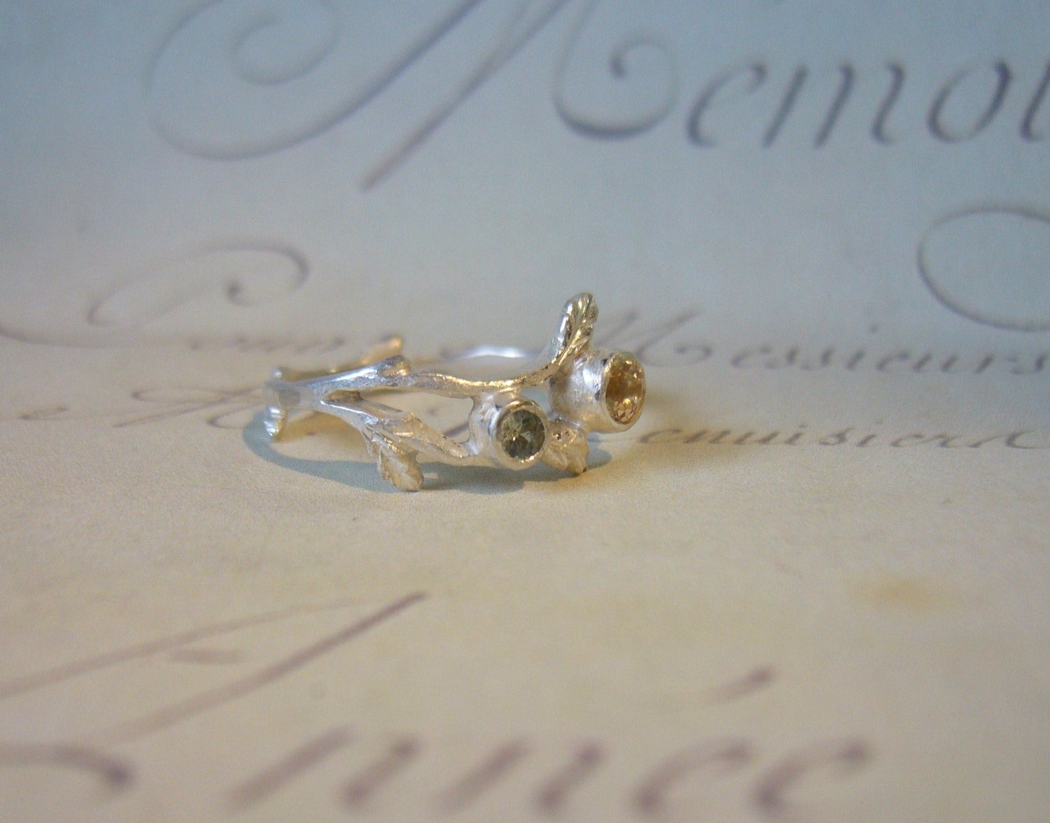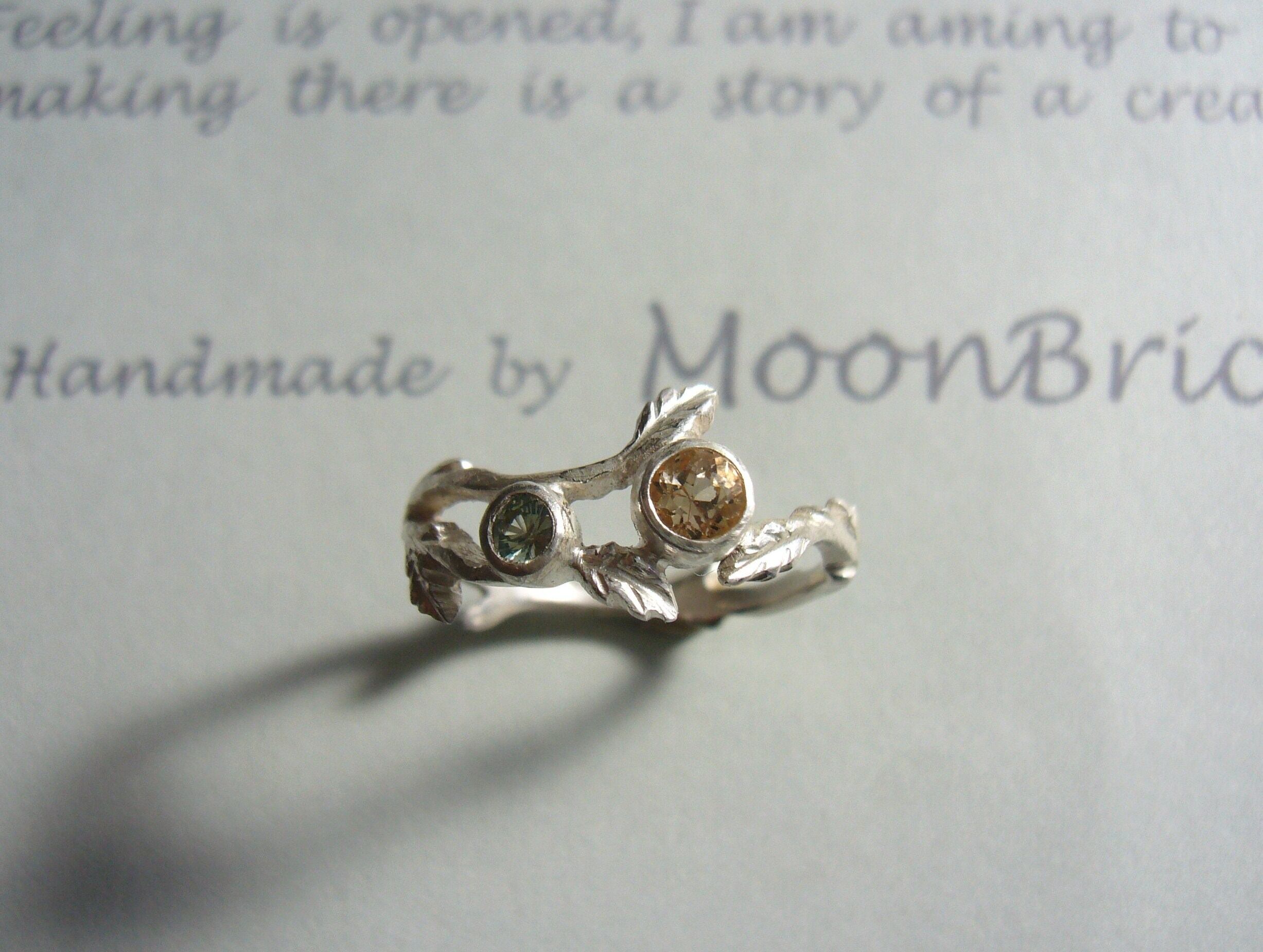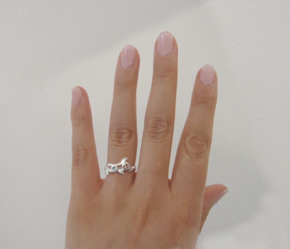 小枝にシャンパンガーネットとグリーンサファイアを実の様に留めたすっきりと繊細なリングです。