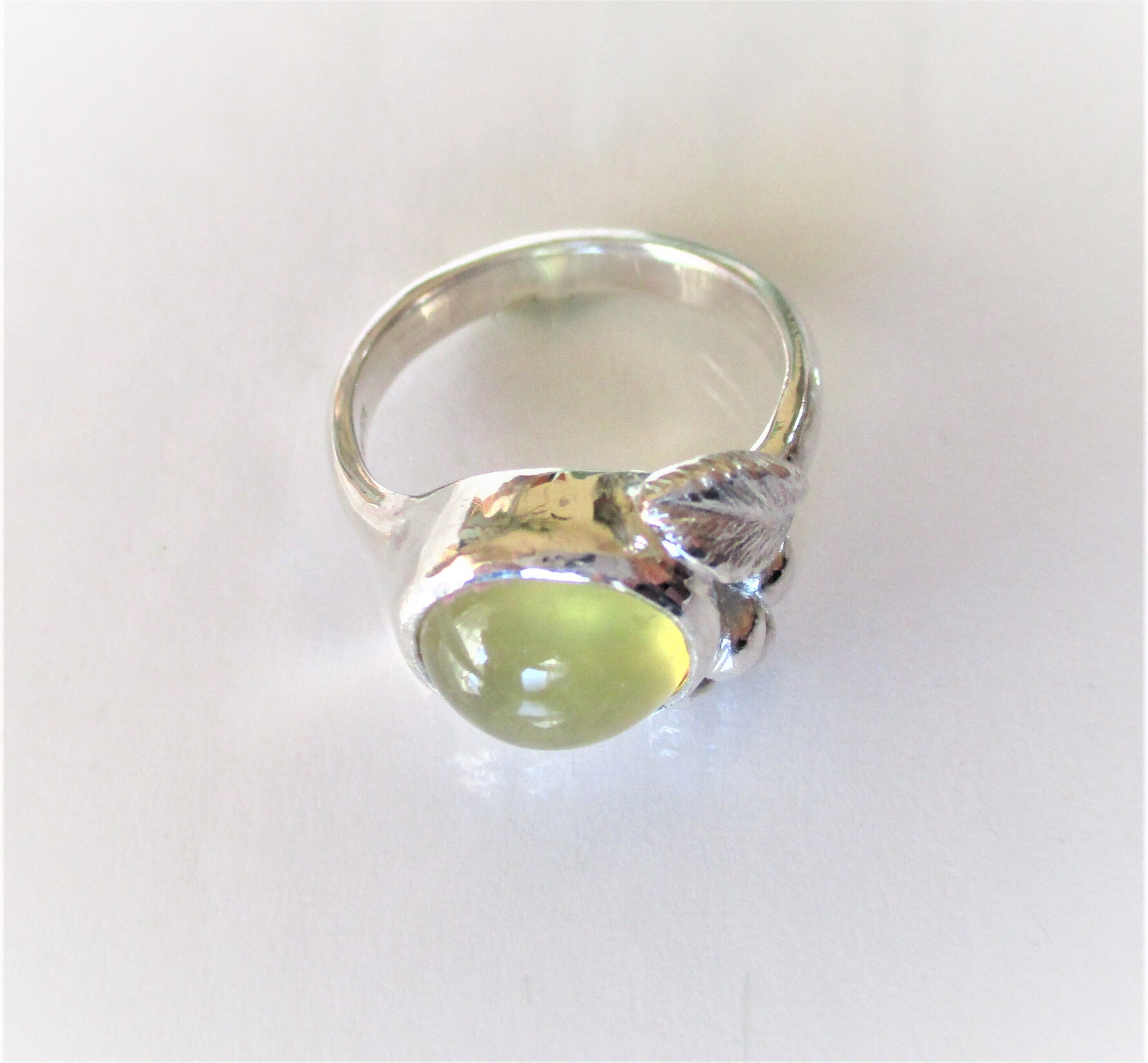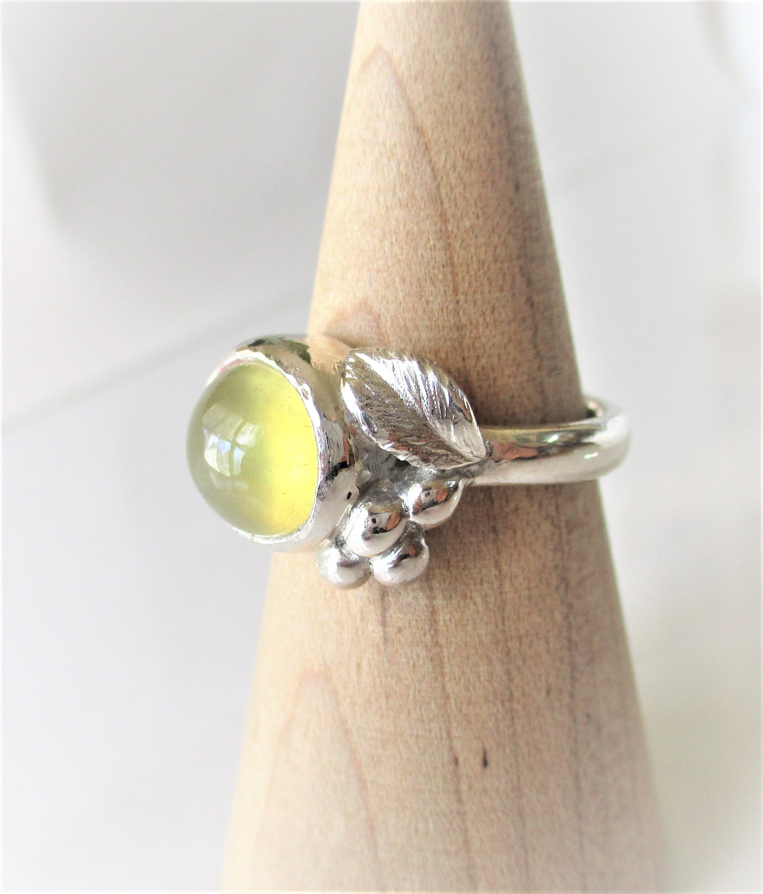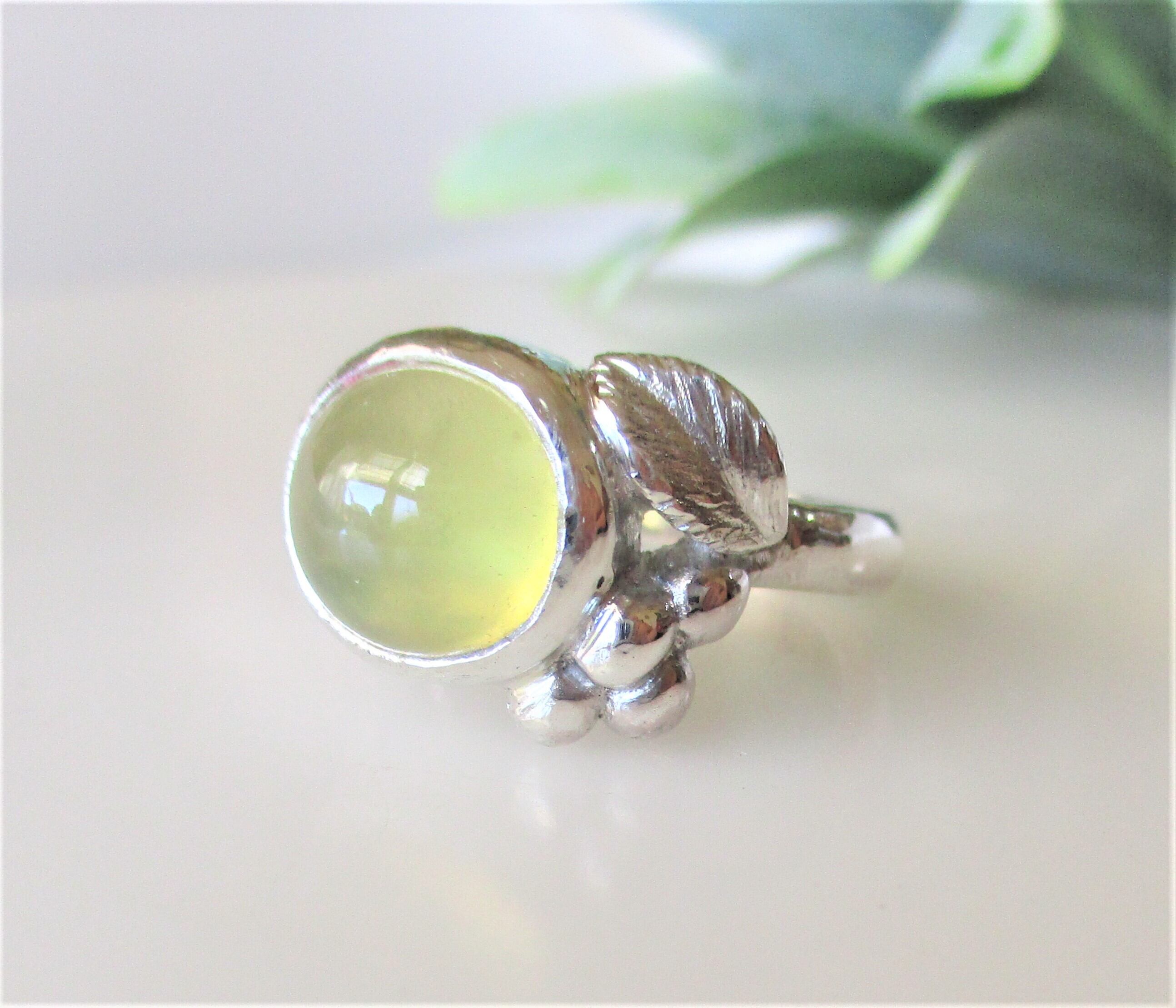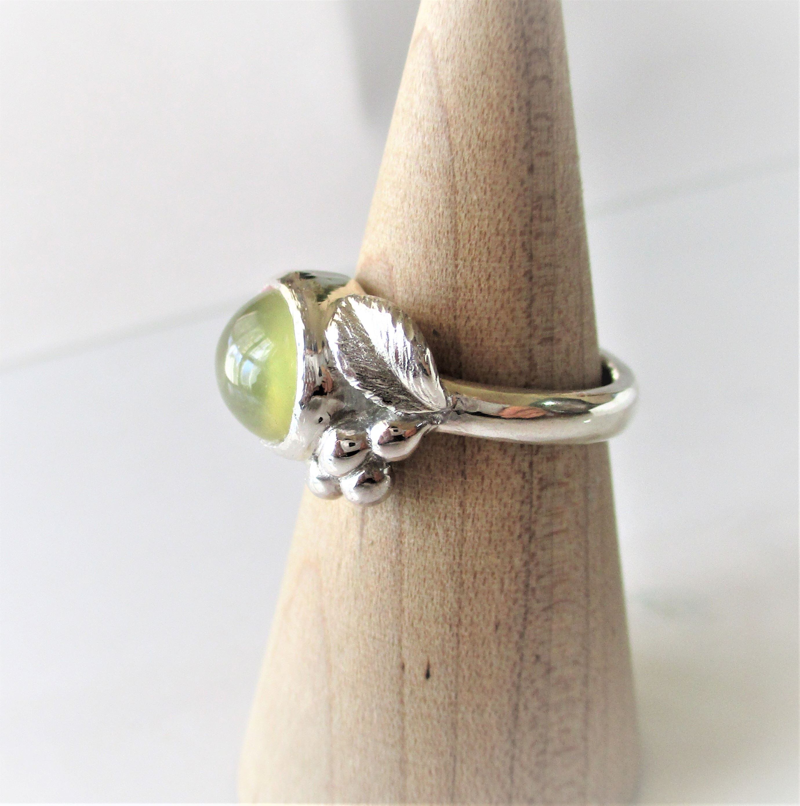 シルバーのリングフレームには葡萄と葉の精密な造形を施して槌目を打ったベゼルで石をセッティングしました。