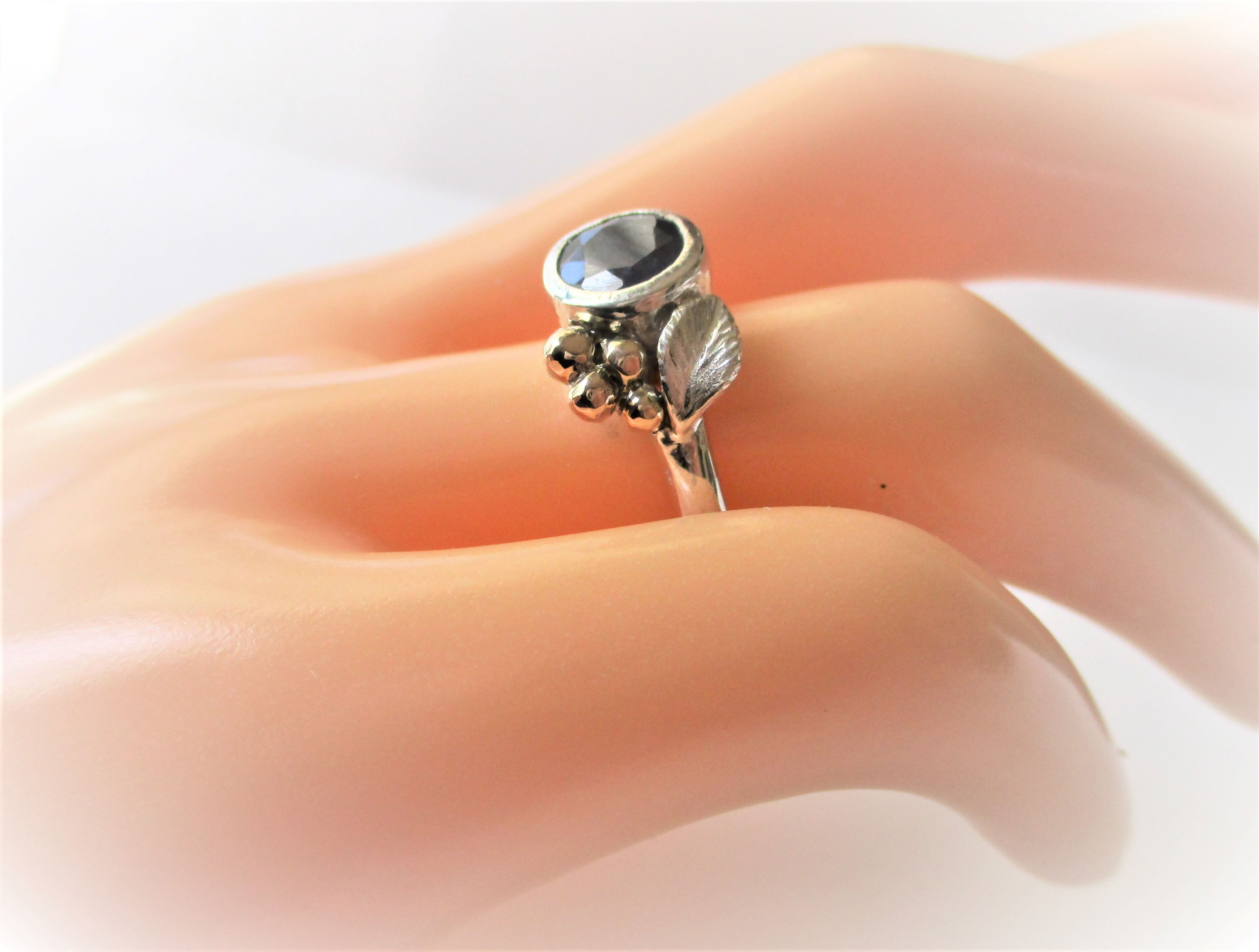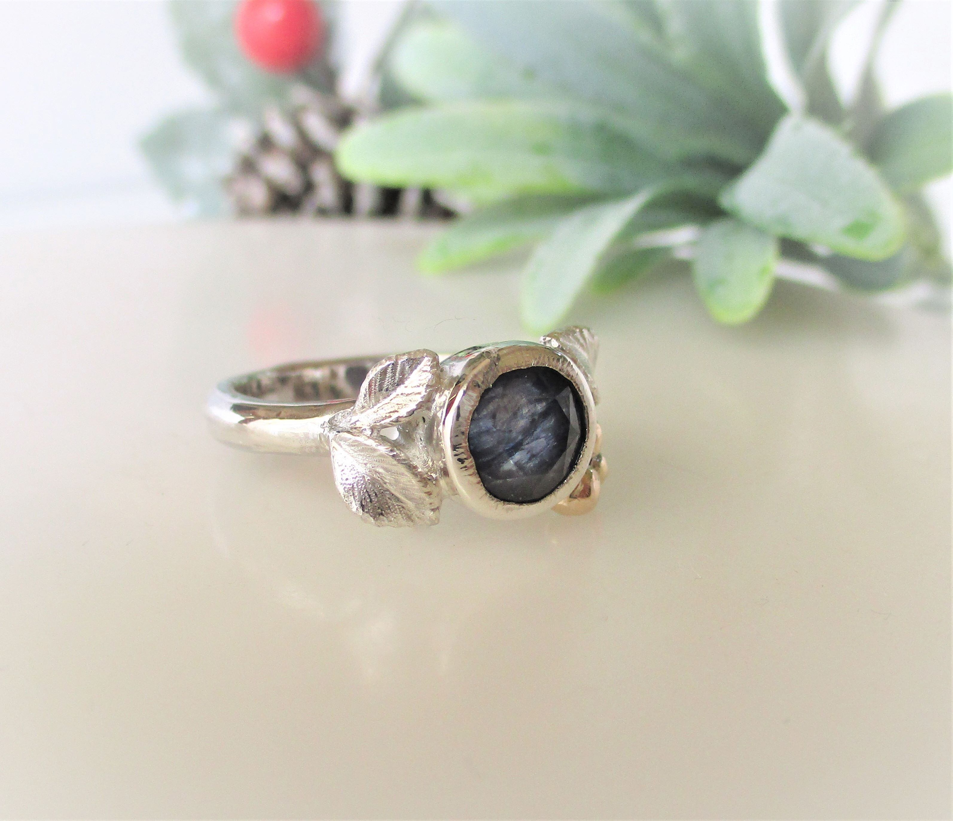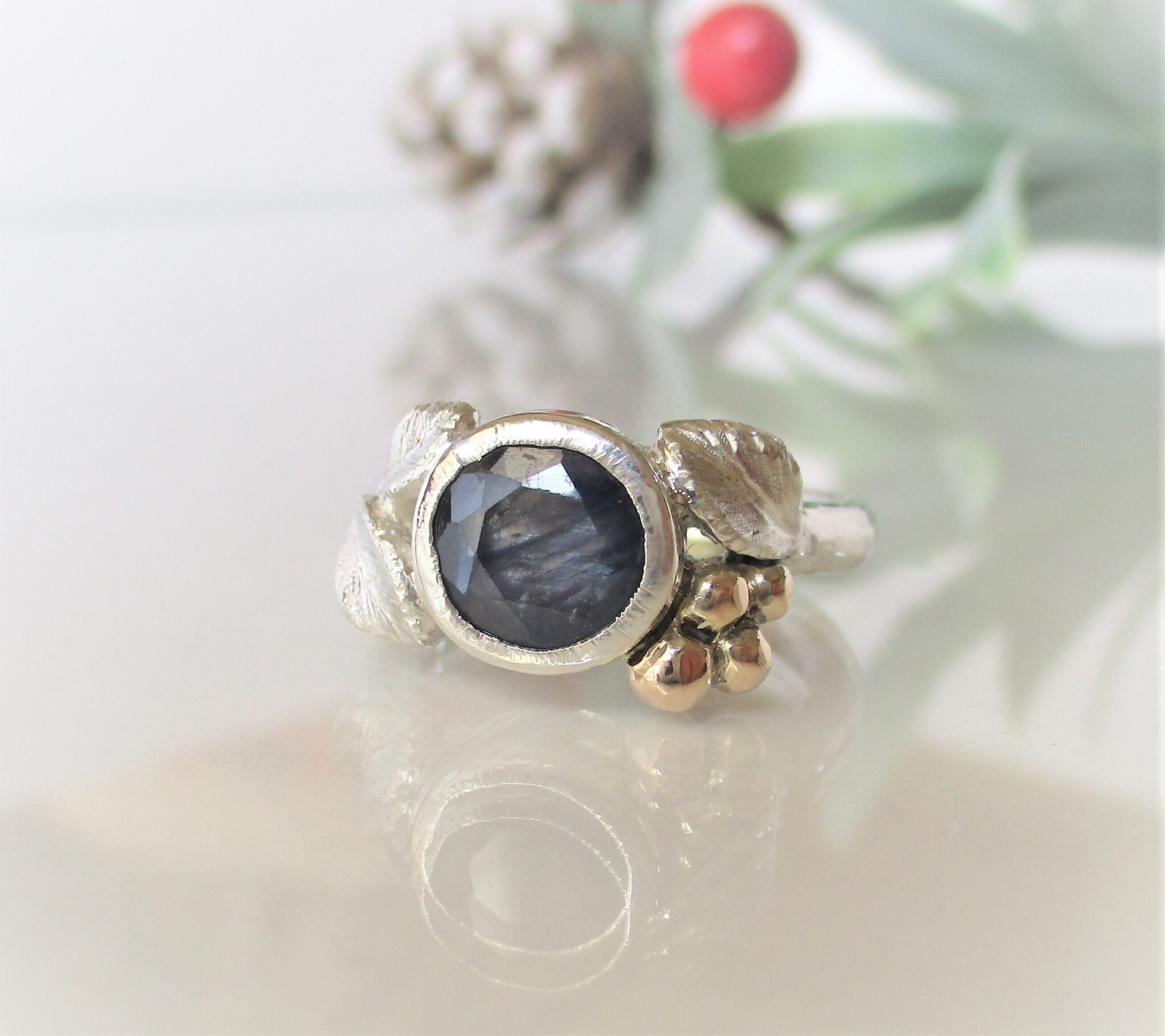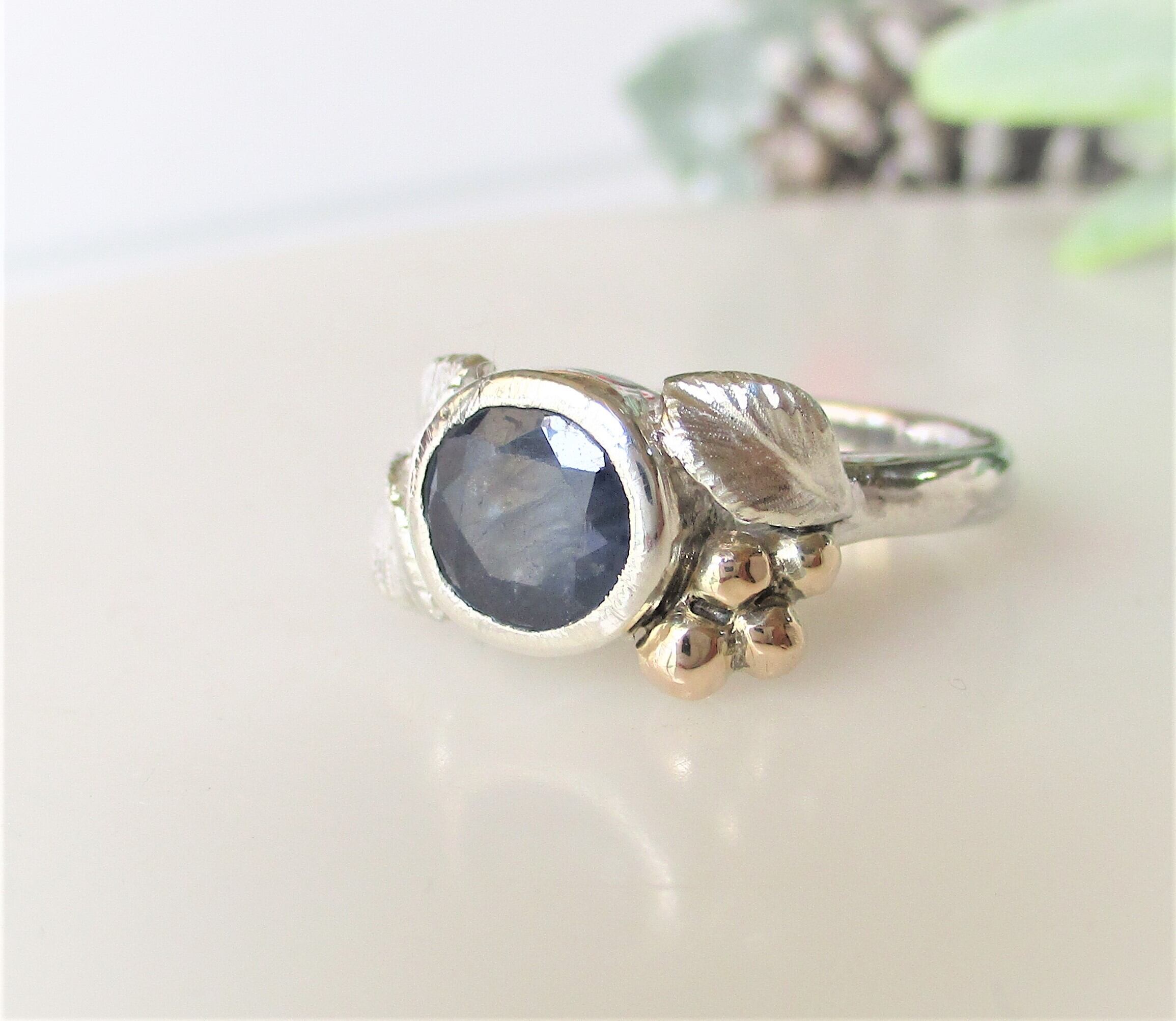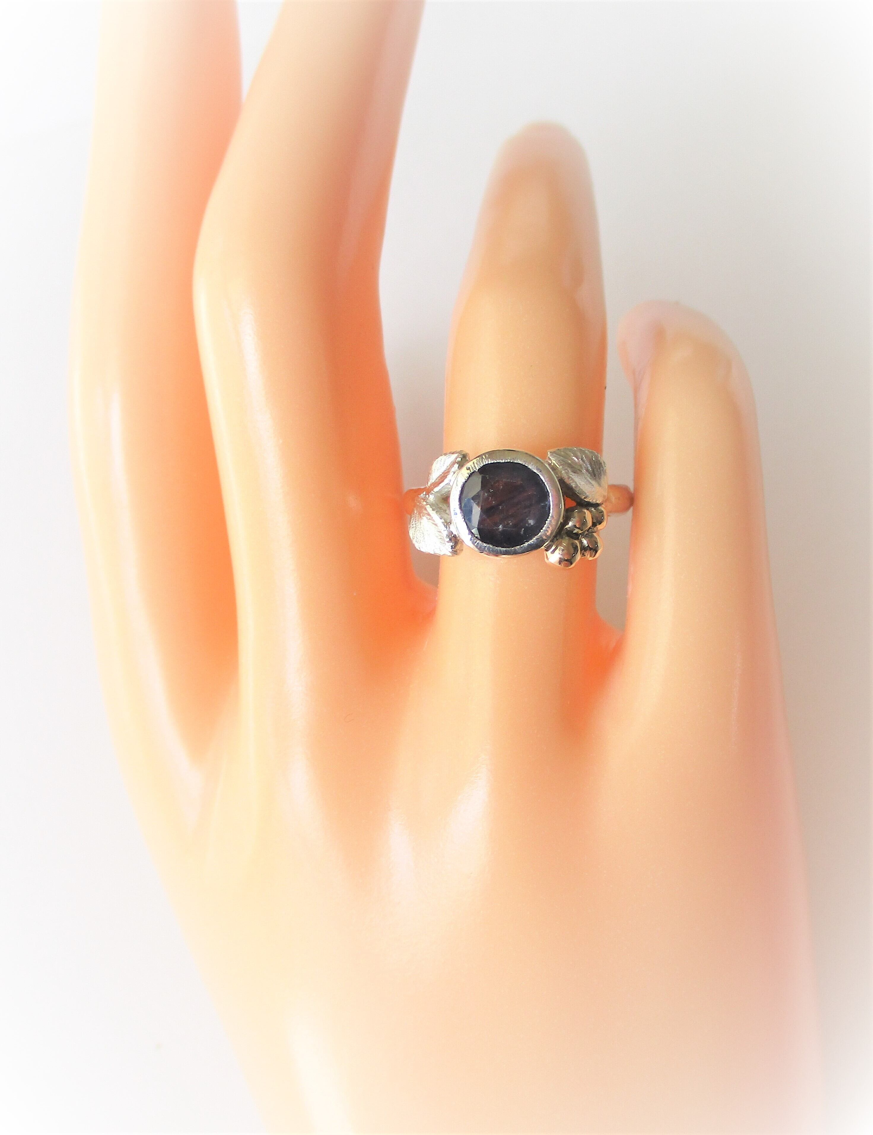 いびつなラウンドカットが可愛いこのサファイアは濃いめのブルーの中にナチュラルなインクルージョンを含んでいるのが特徴の魅力的な石です。