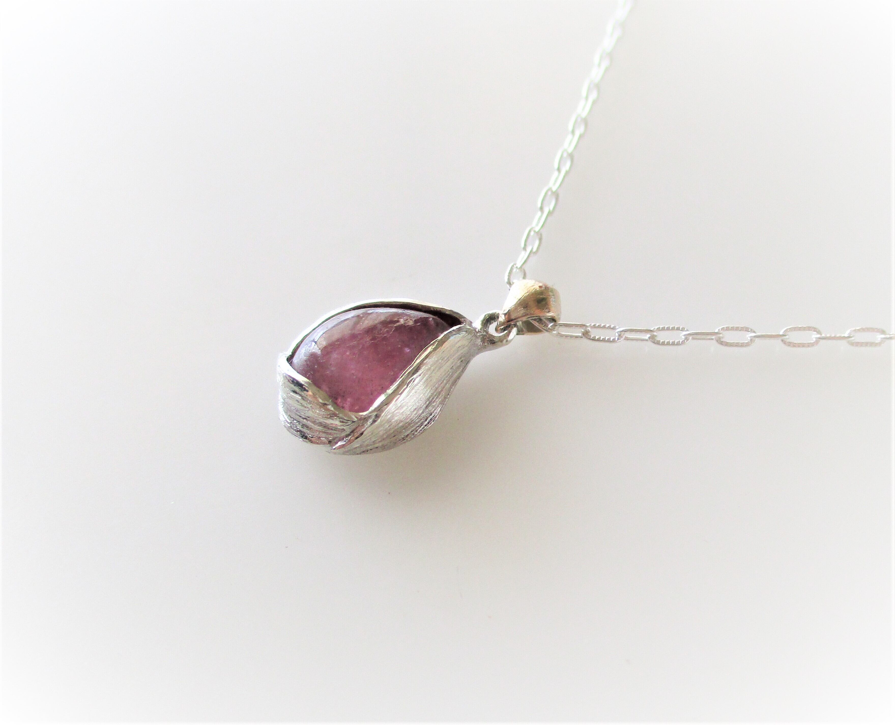 シルバーのペンダントフレームは3枚のリーフで石を留め