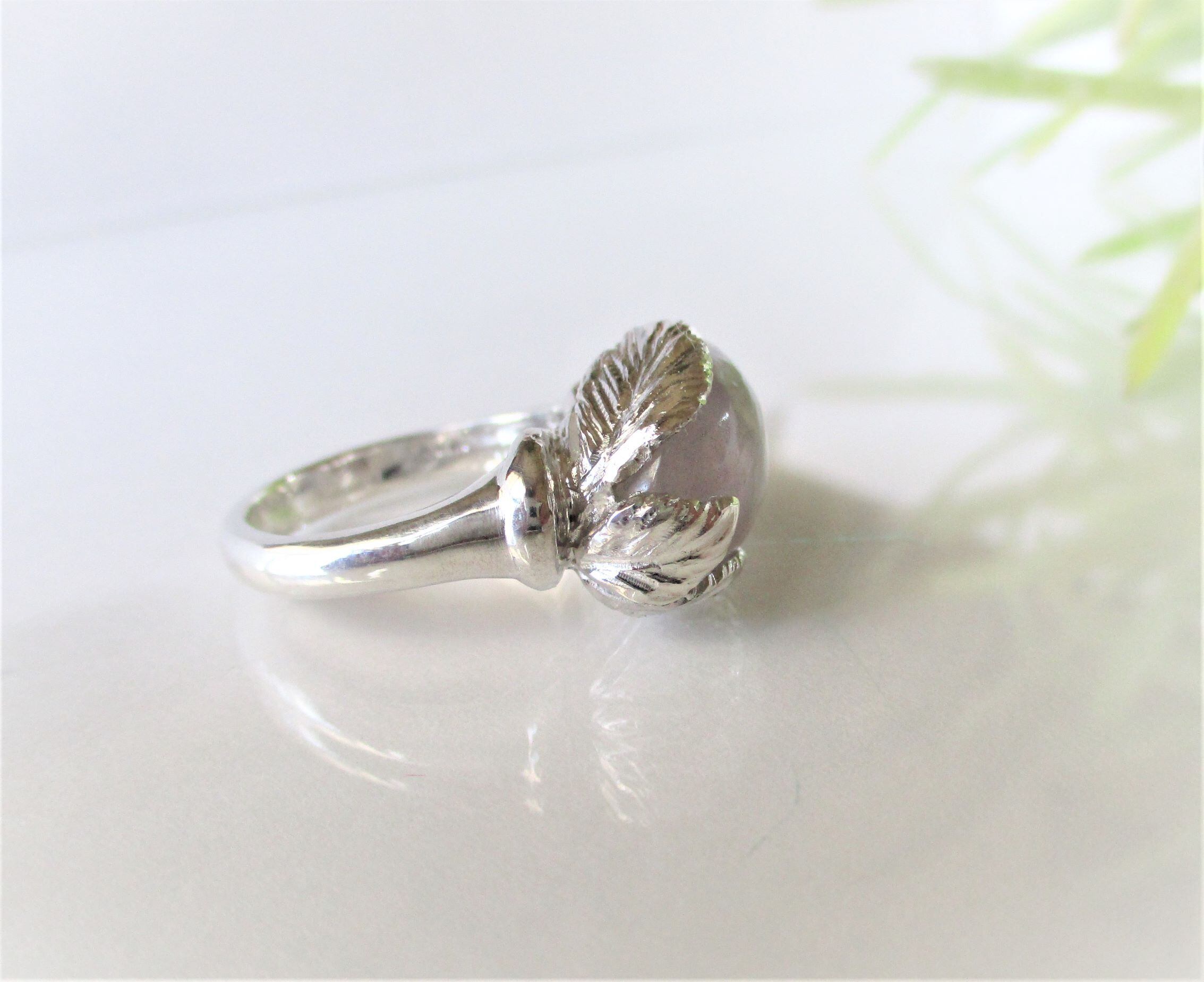 4枚のリーフを施したリングフレームは、繊細な葉脈を入れた葉のベゼルで石を留め、ハンドメイド感をより強調しました。