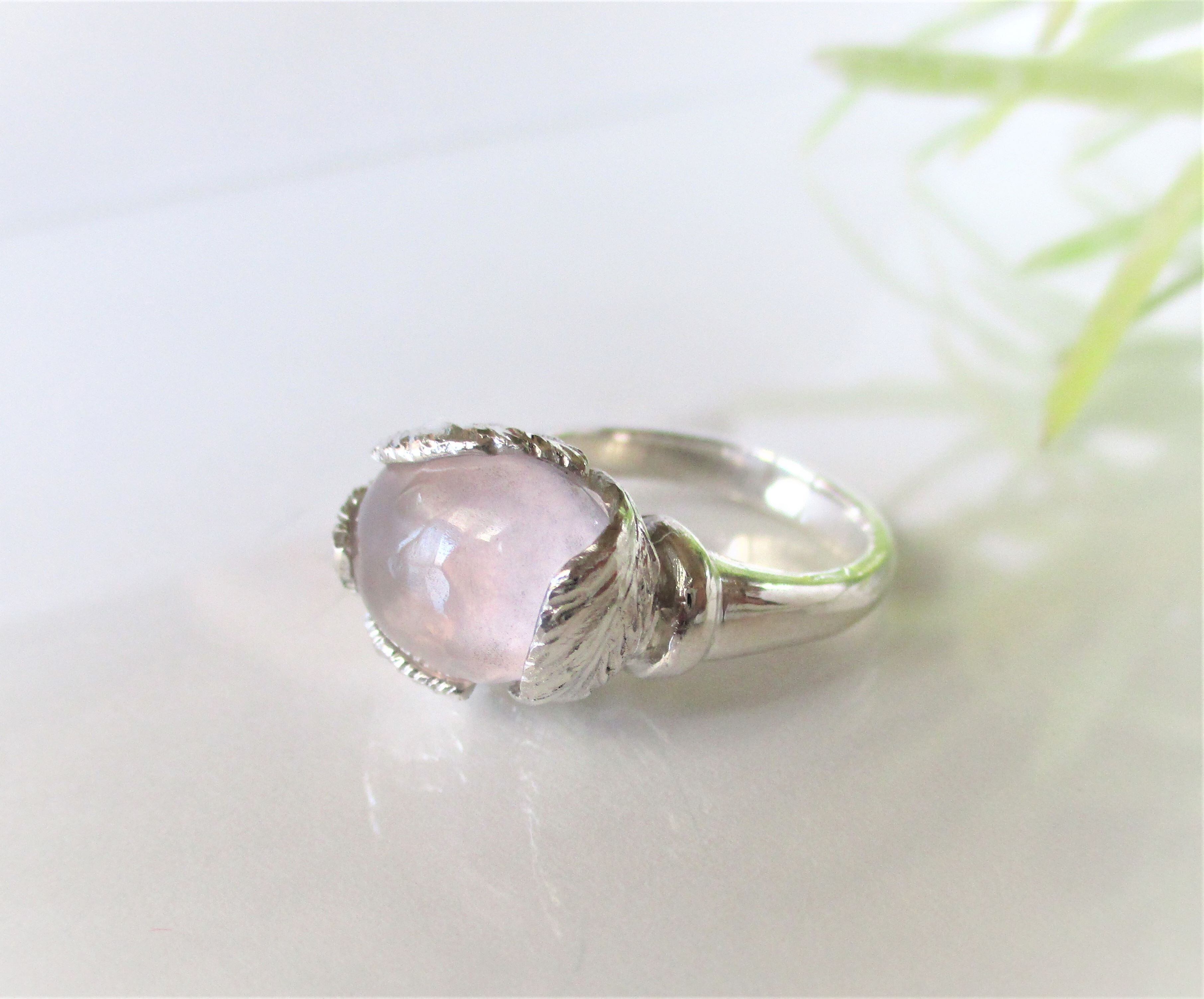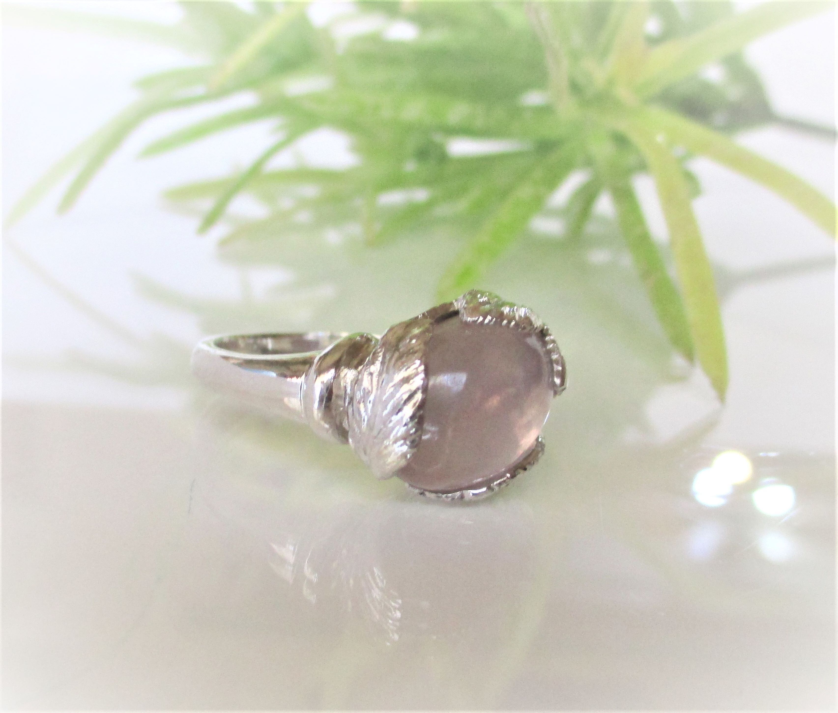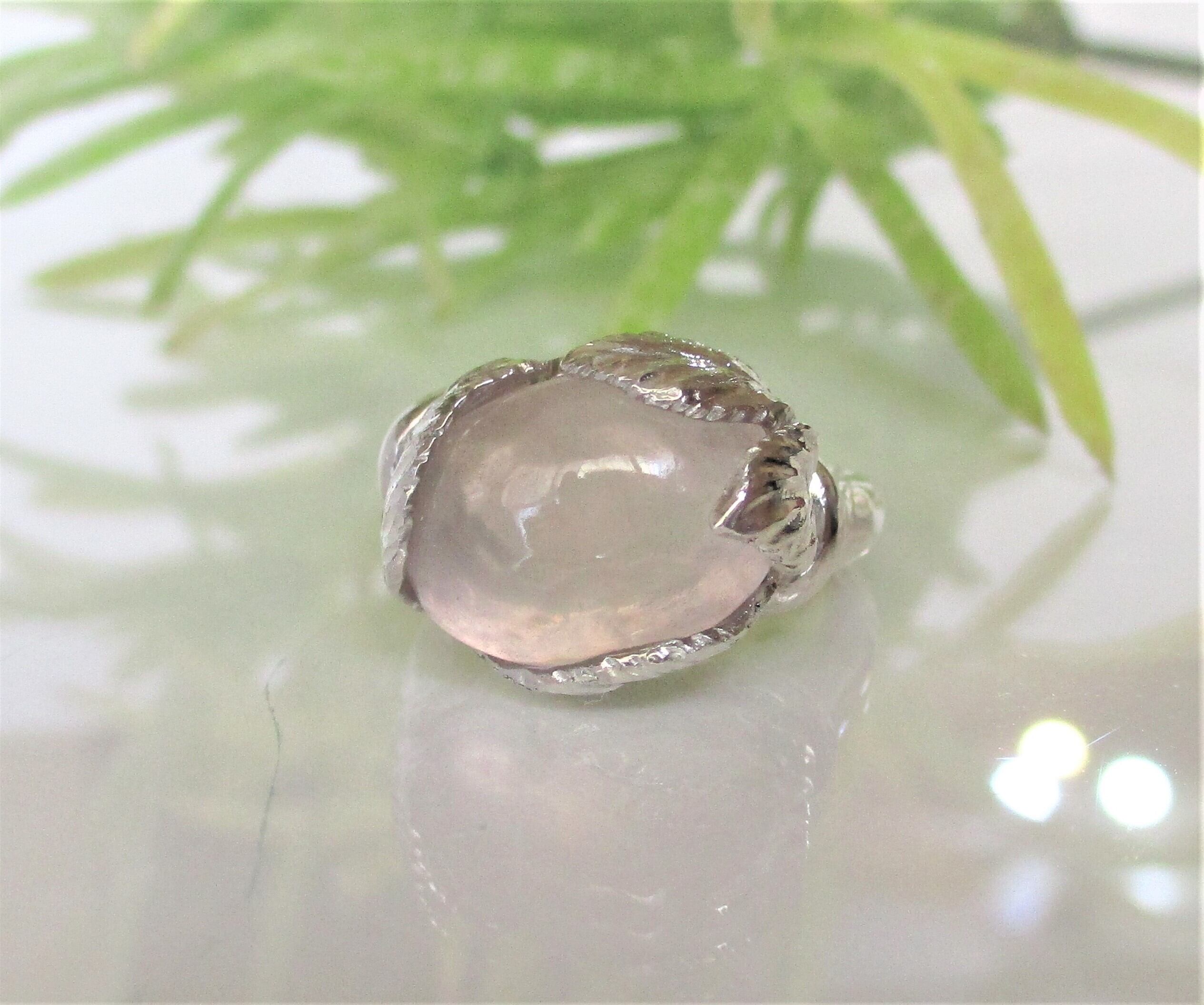 マダガスカル産の天然のローズクォ―ツ原石を手摺りで表面に柔らかな凹凸をつけ、ボリュームのあるカボッションに磨きました。