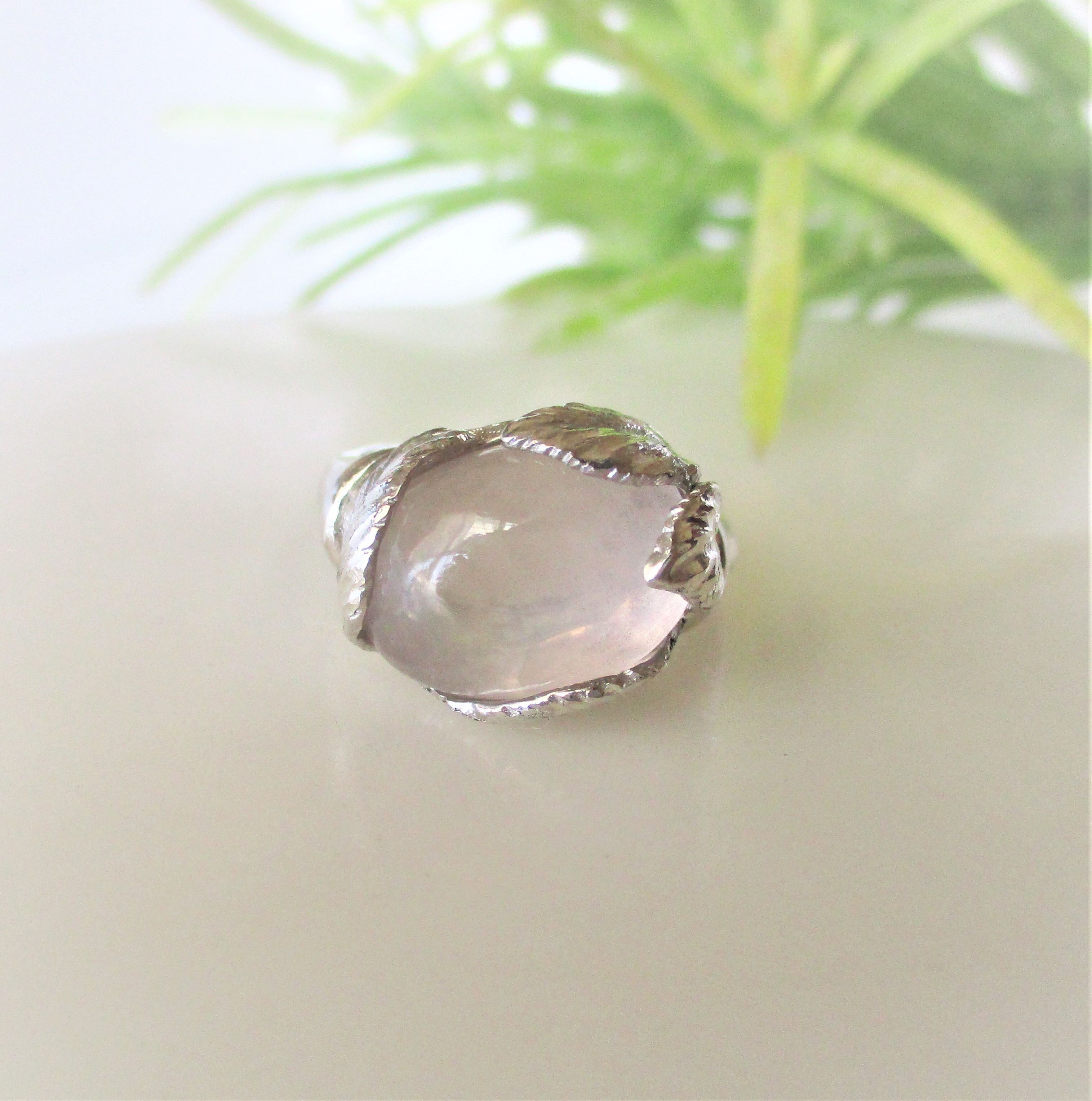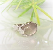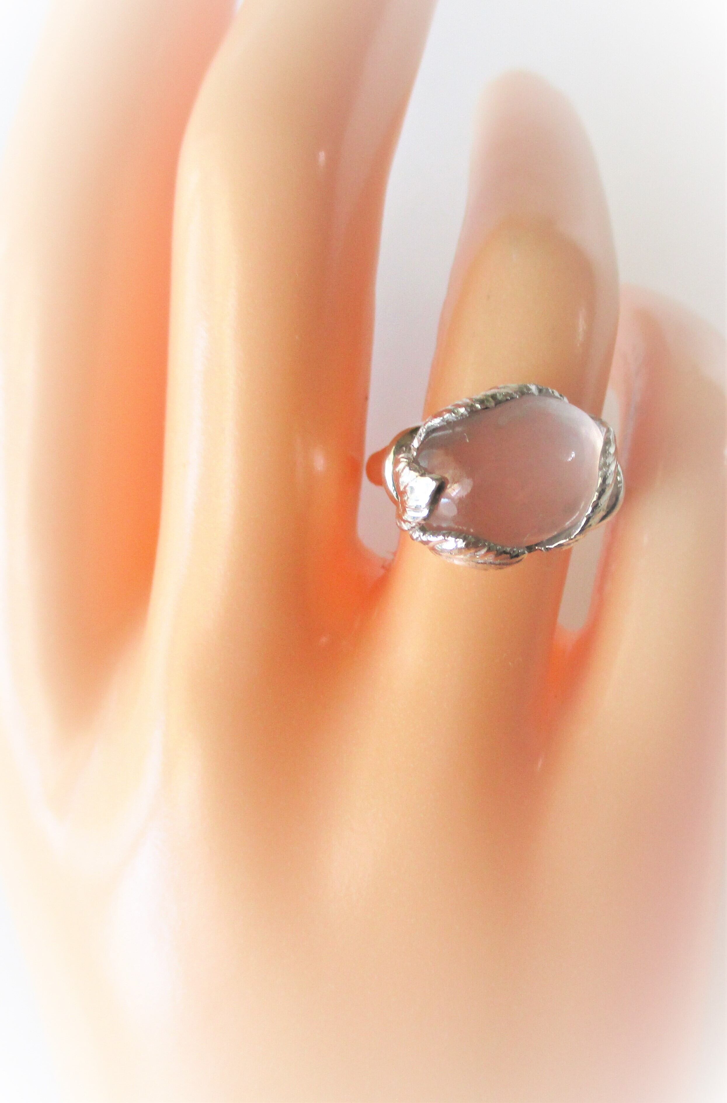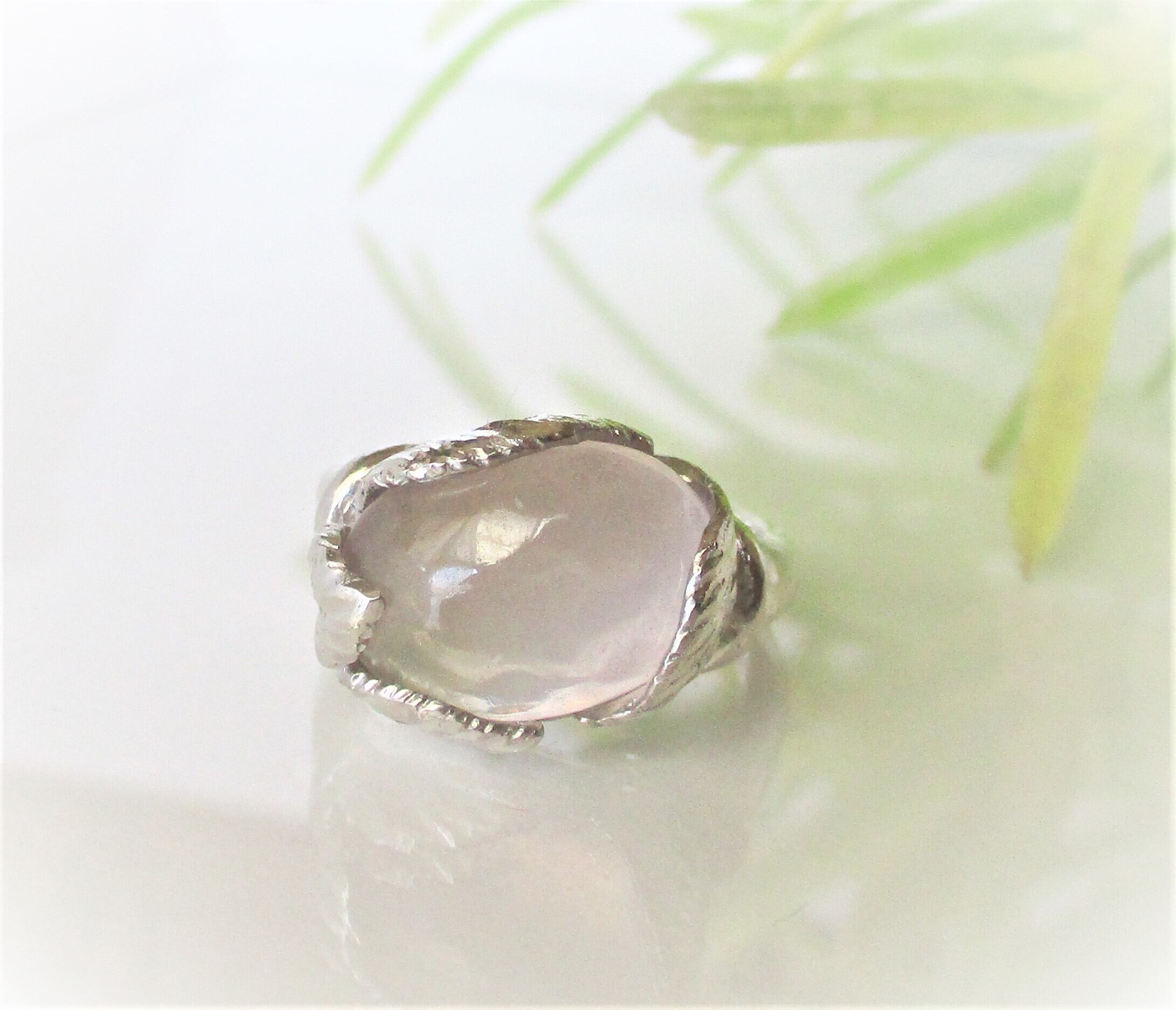 マダガスカル産の天然のローズクォ―ツ原石を手摺りで表面に柔らかな凹凸をつけ、ボリュームのあるカボッションに磨きました。