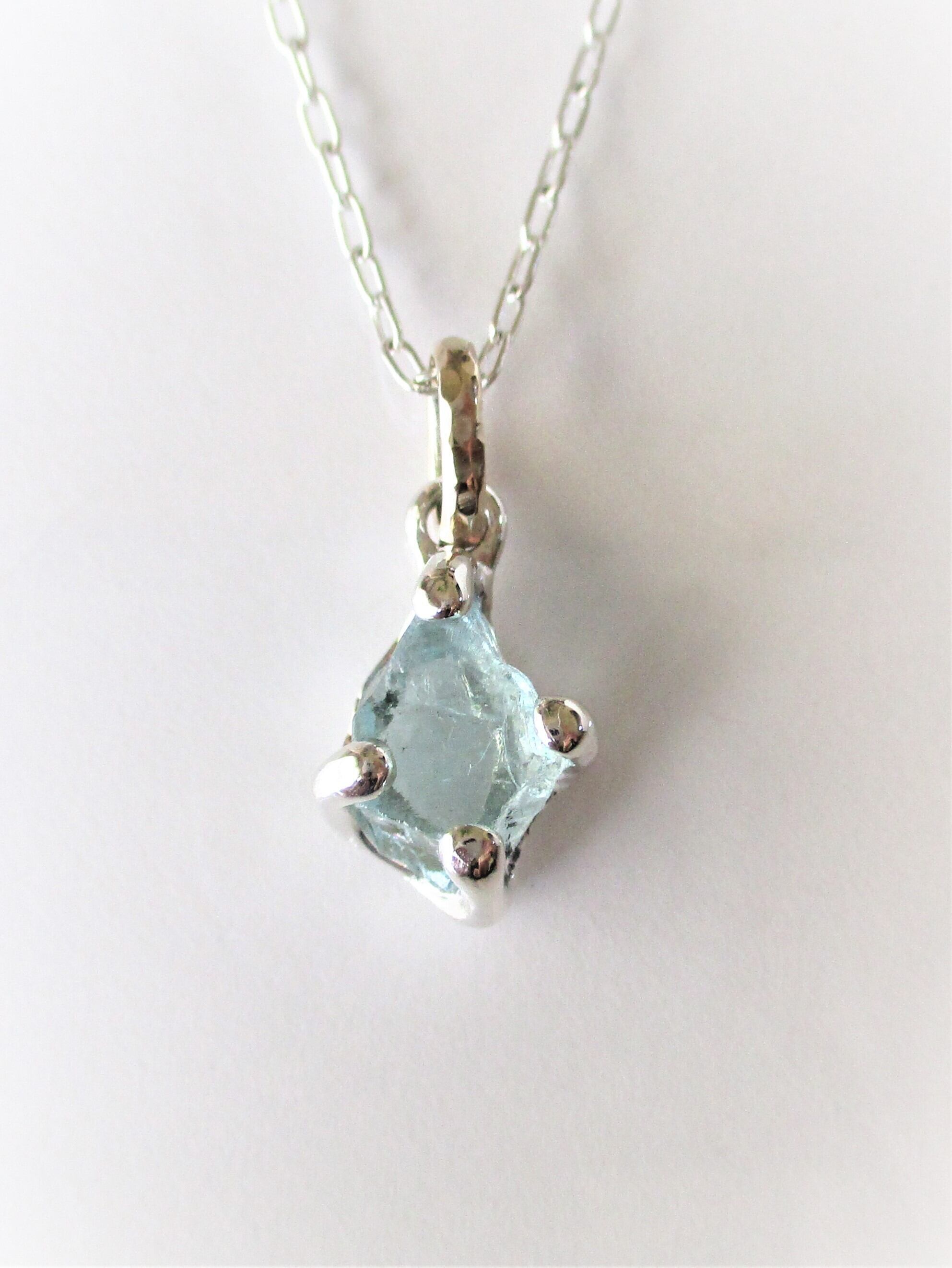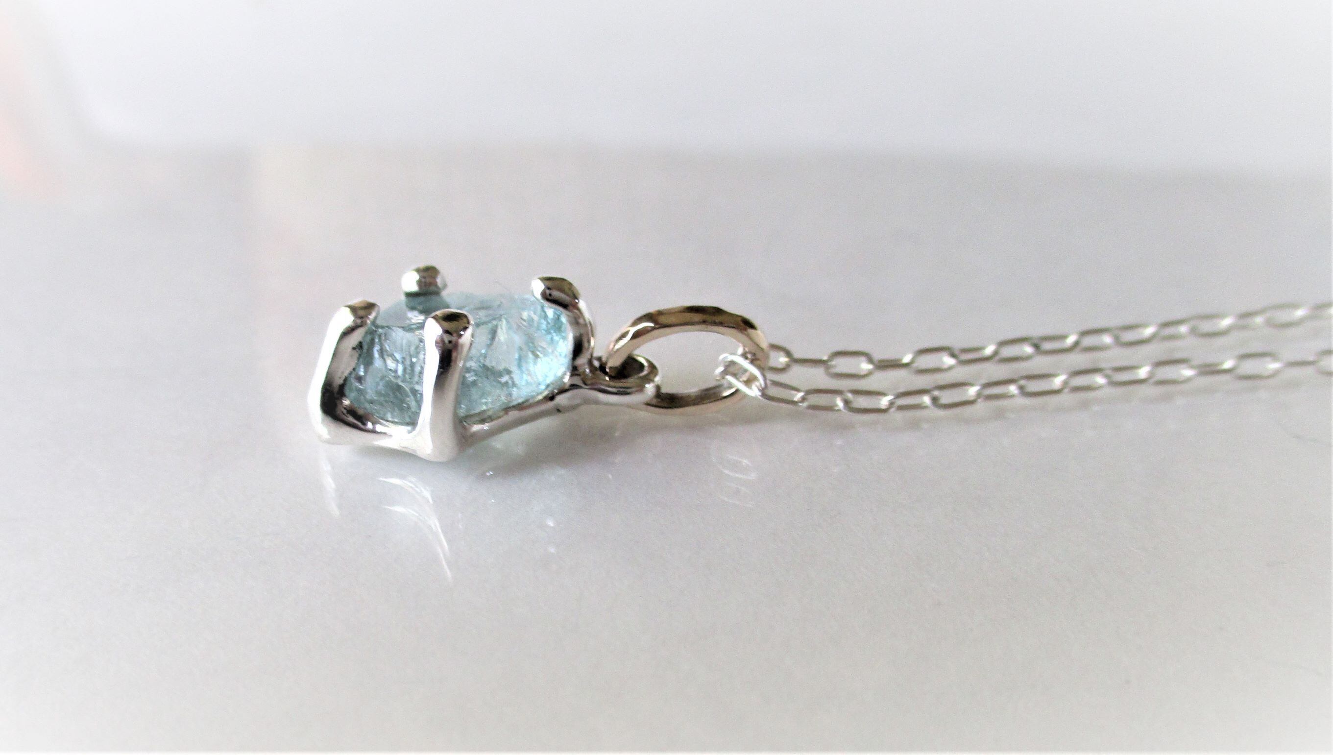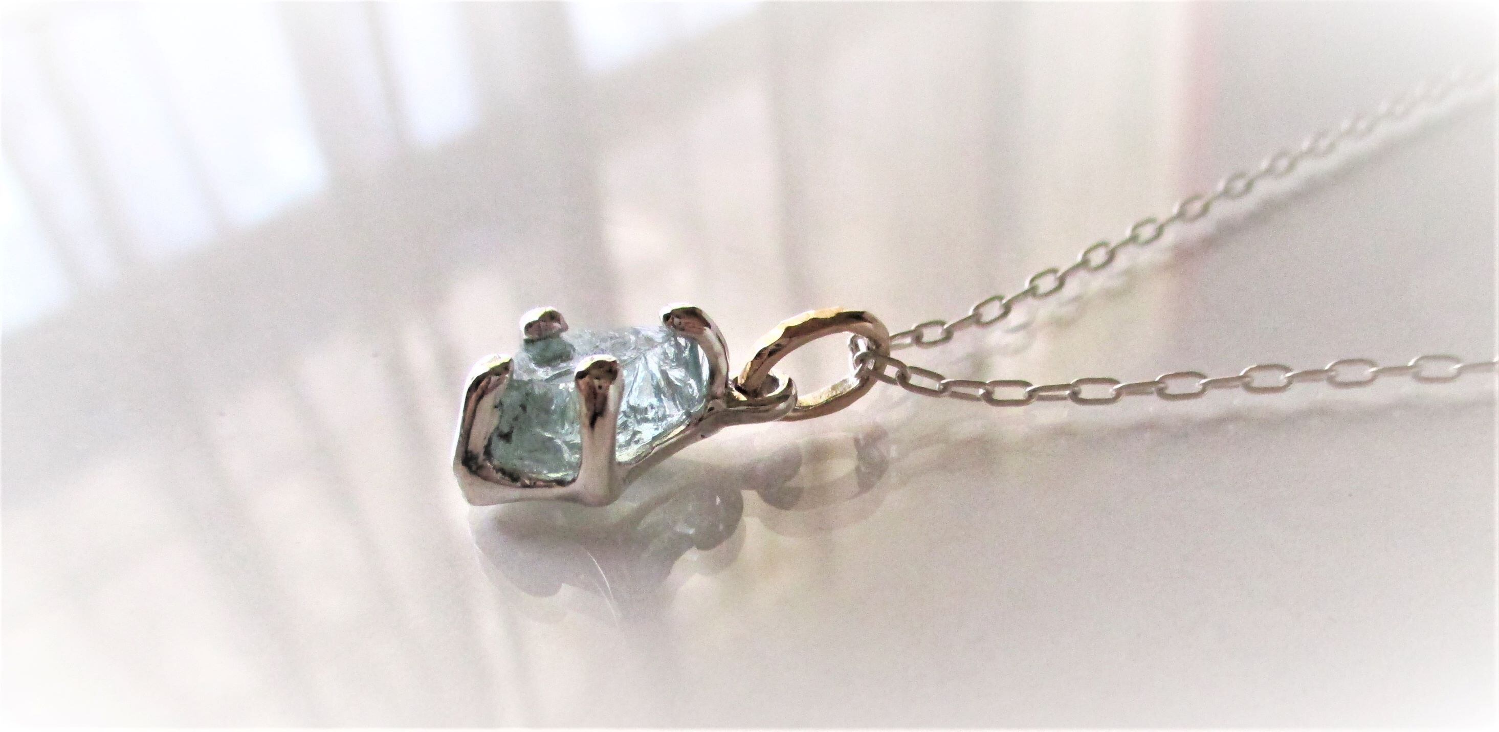 とても涼し気でオシャレな存在感のあるアクアマリン原石のロングペンダントです。