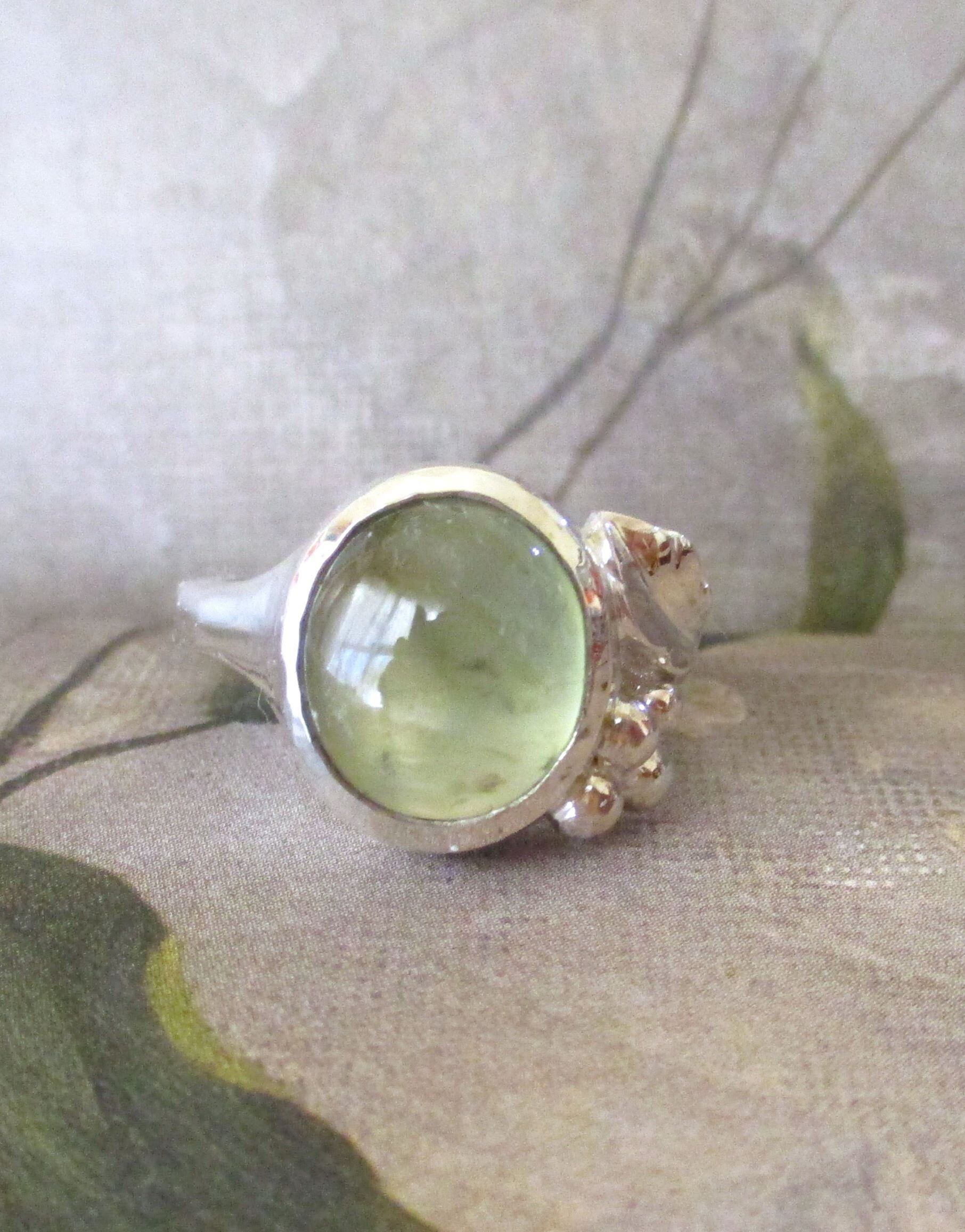 シルバーのリングフレームには葡萄と葉の造形を施して槌目を打ったベゼルで石をセッティングしました。