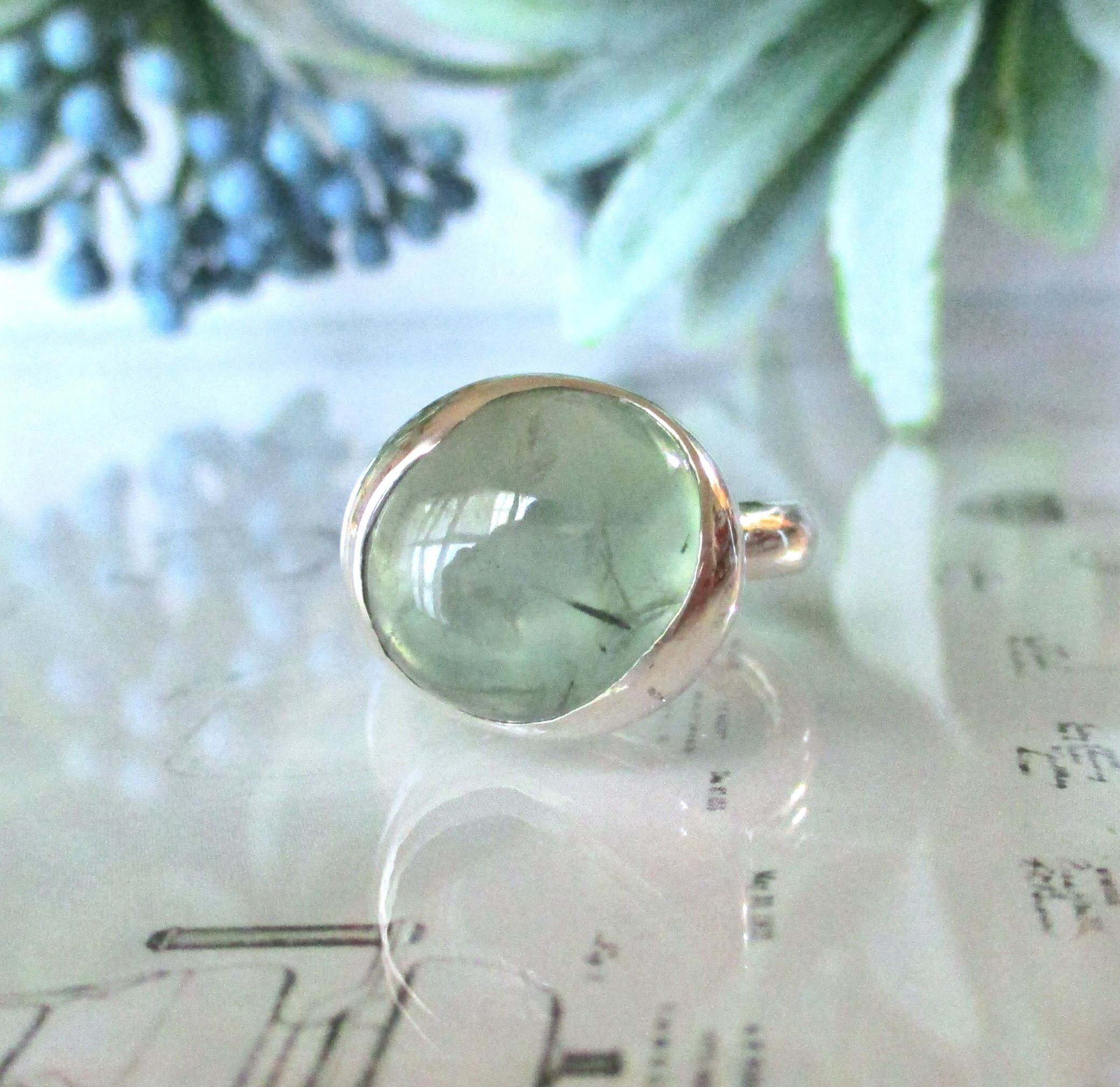 ポッコリと楕円形のプレナイトは、ブラックルチルを内包したほんのりとグレーを帯びたマスカットカラーがとても美しい石です。