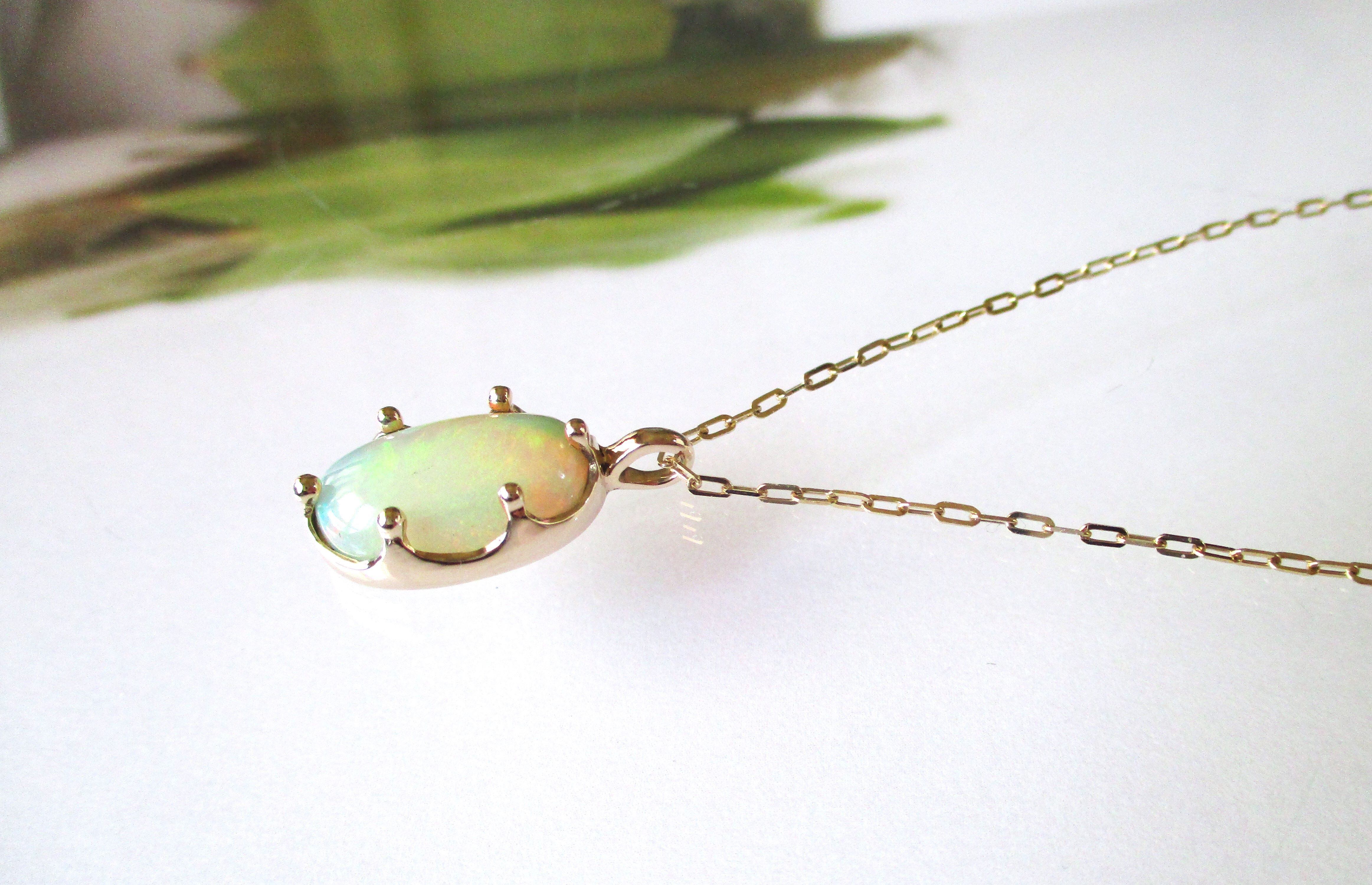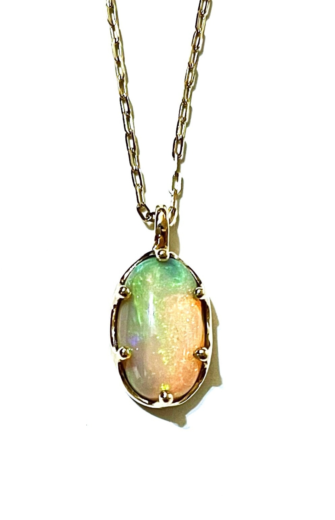 乳白の中に浮かぶピンク、オレンジ、グリーン、ブルーカラーなどの遊色が溶け合うとても美しいエチオピアン・オパールのK14のペンダントです。