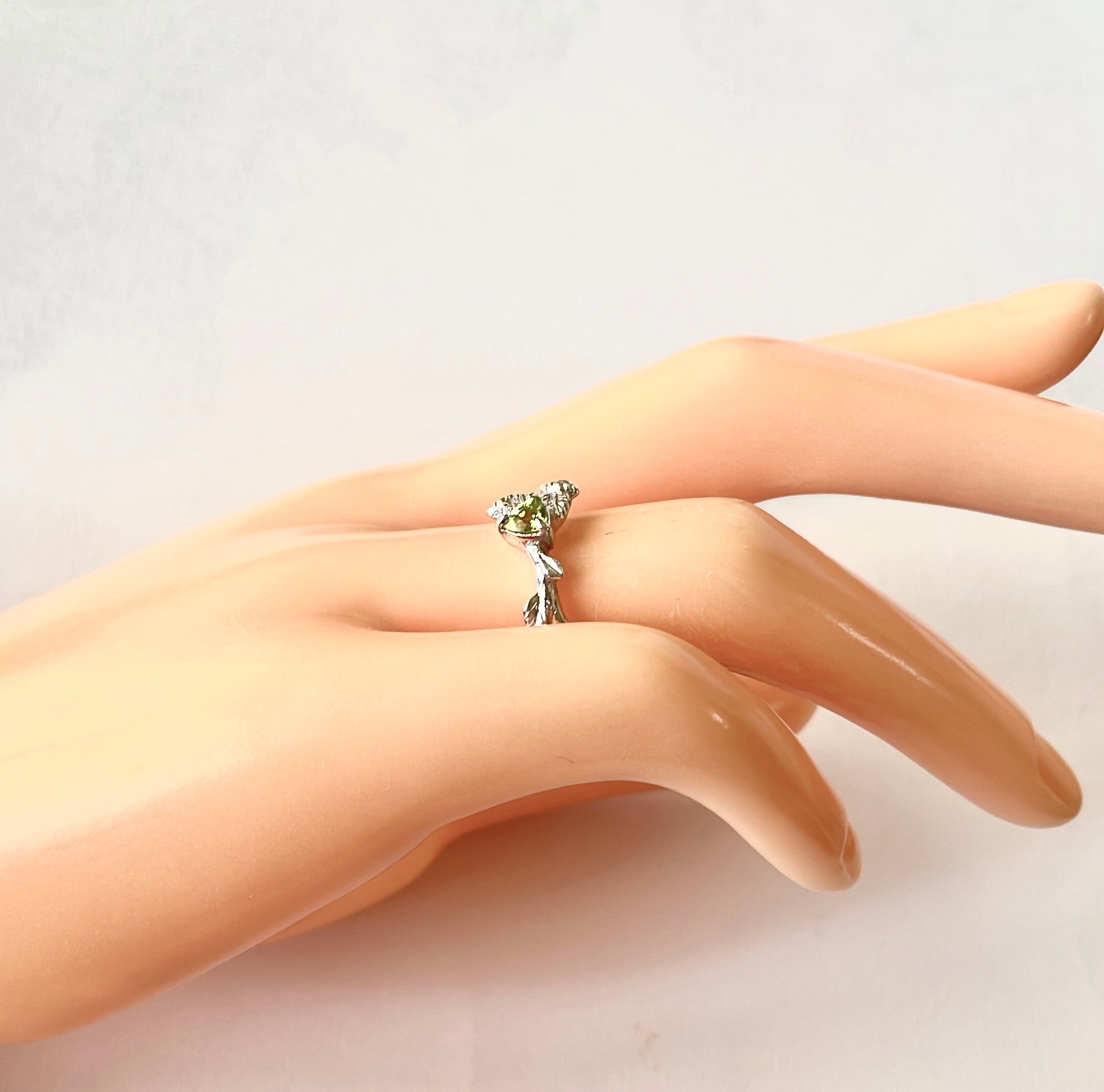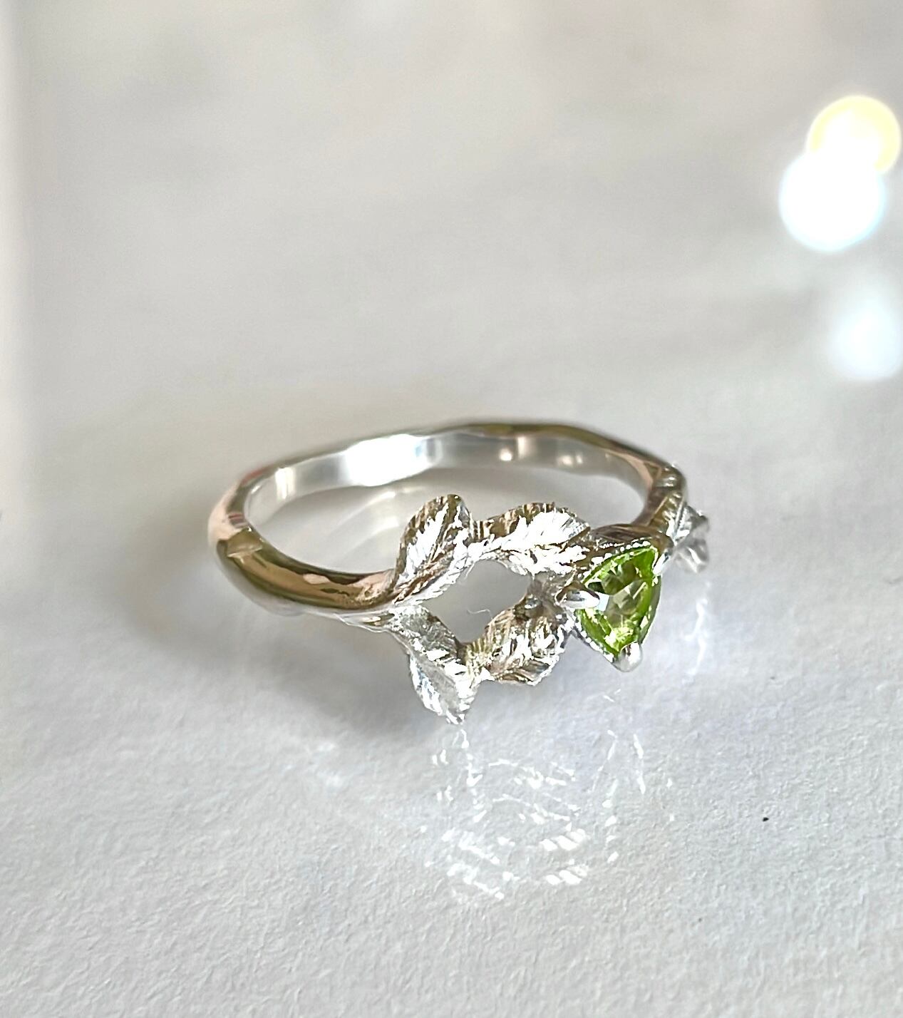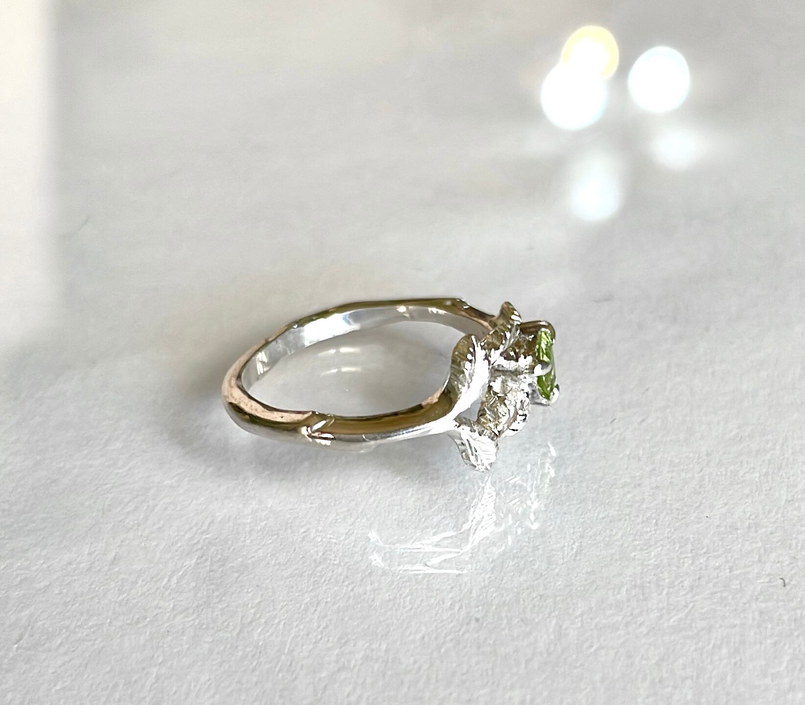 天然のペリドットを使用した、リーフモチーフのエレガントな指輪です。