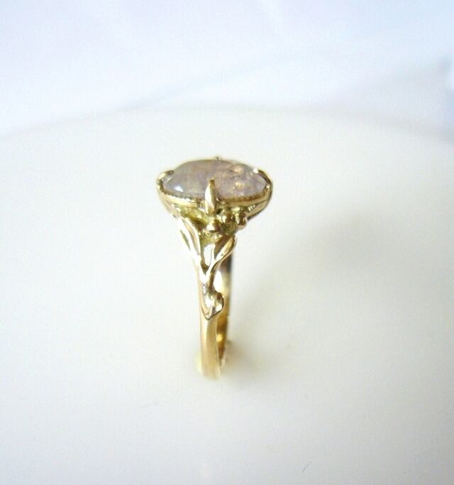 ボタニカルテイストのK14リング枠は刻みを入れた石枠の両脇に