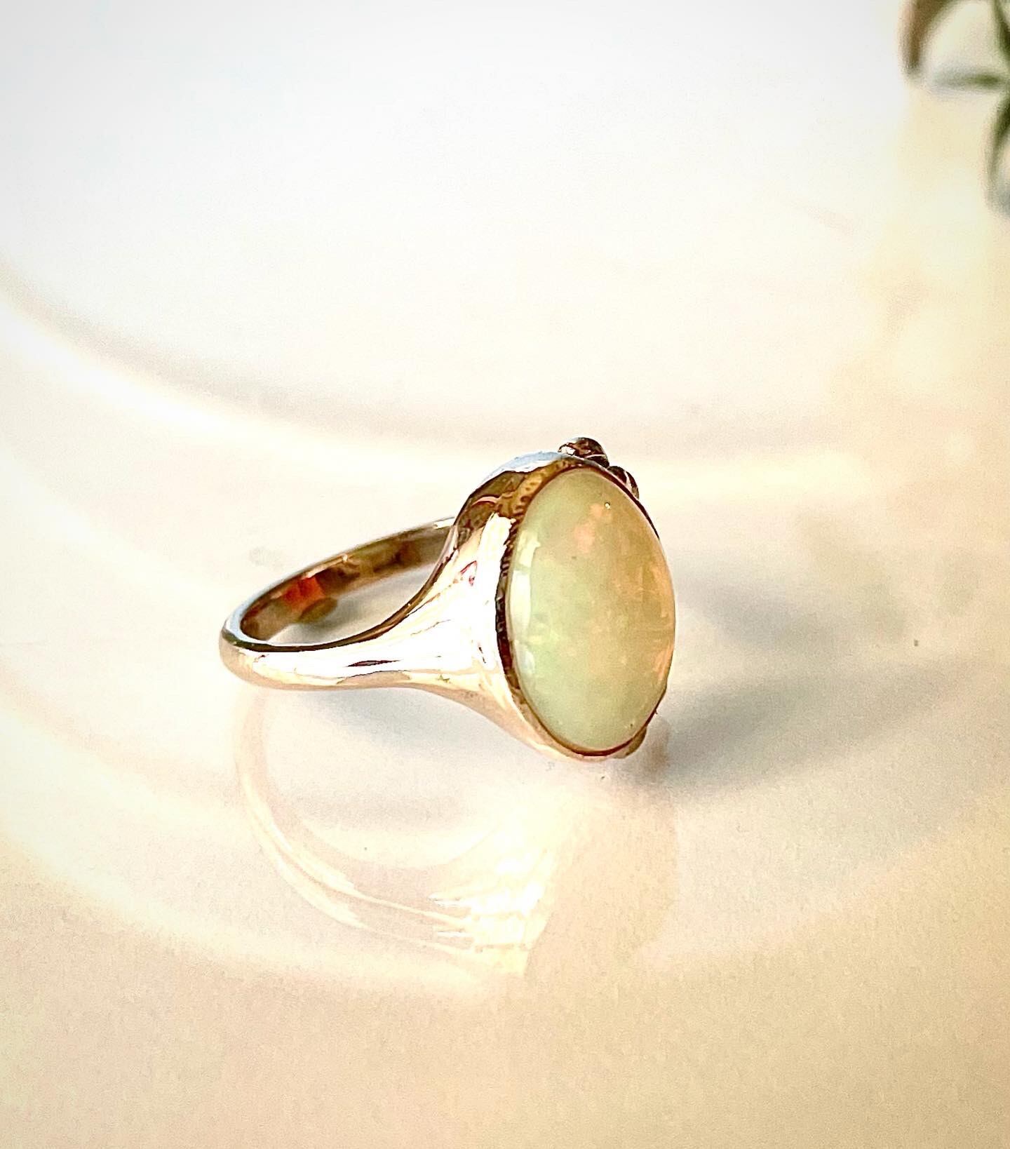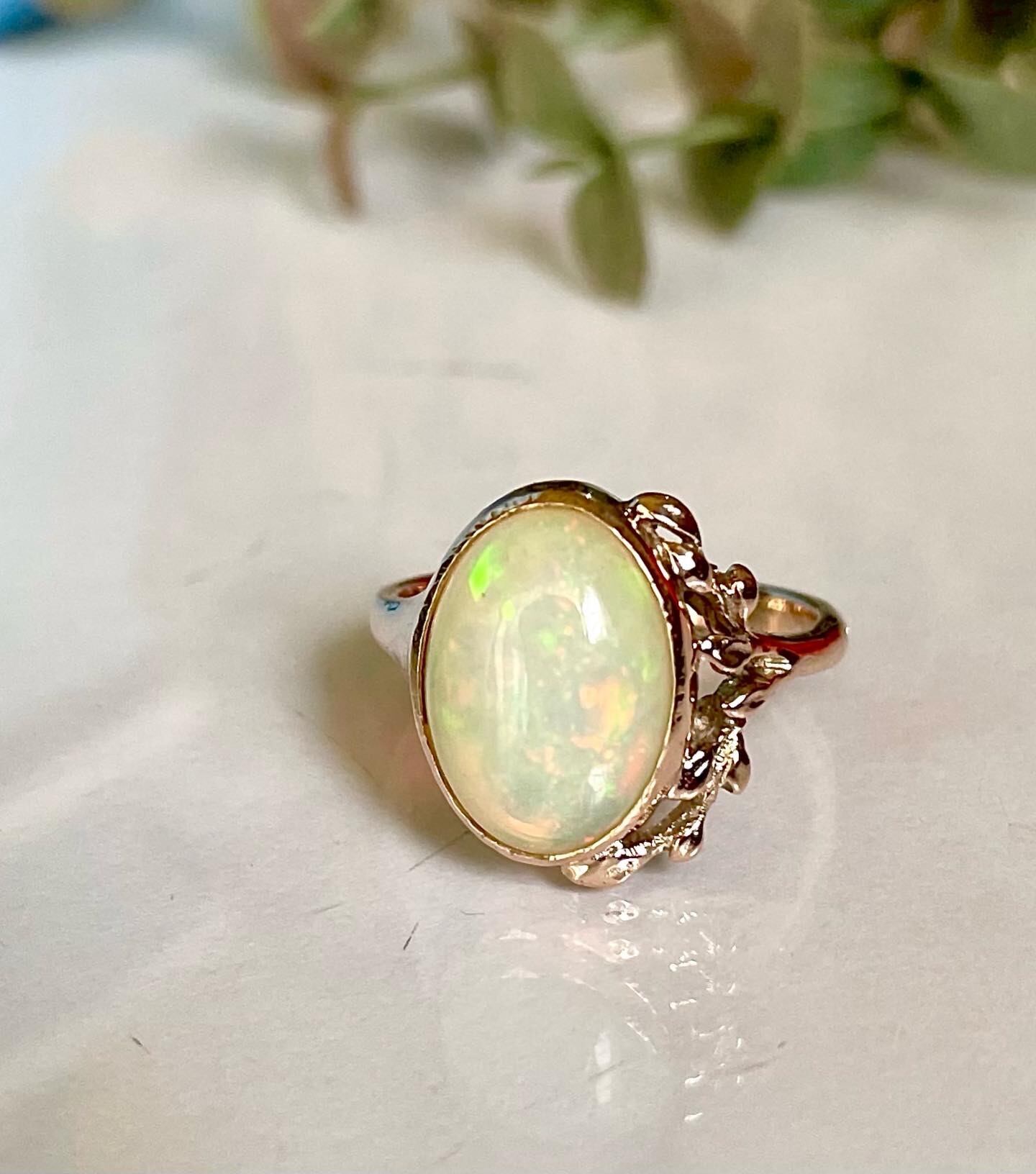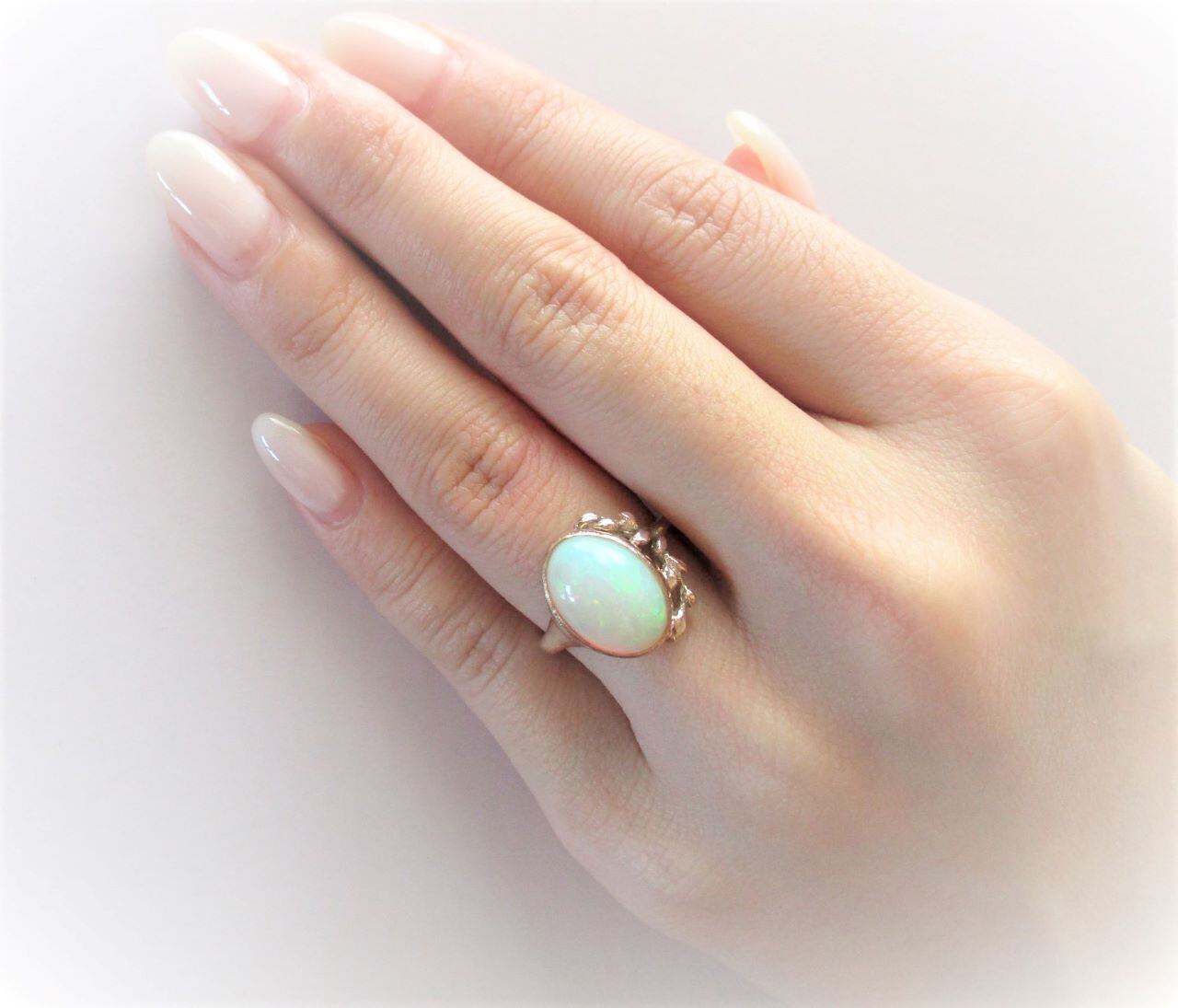 太陽の下でもライトの下でも華やかな表情を見せてくれる美しいオパールの指輪です。